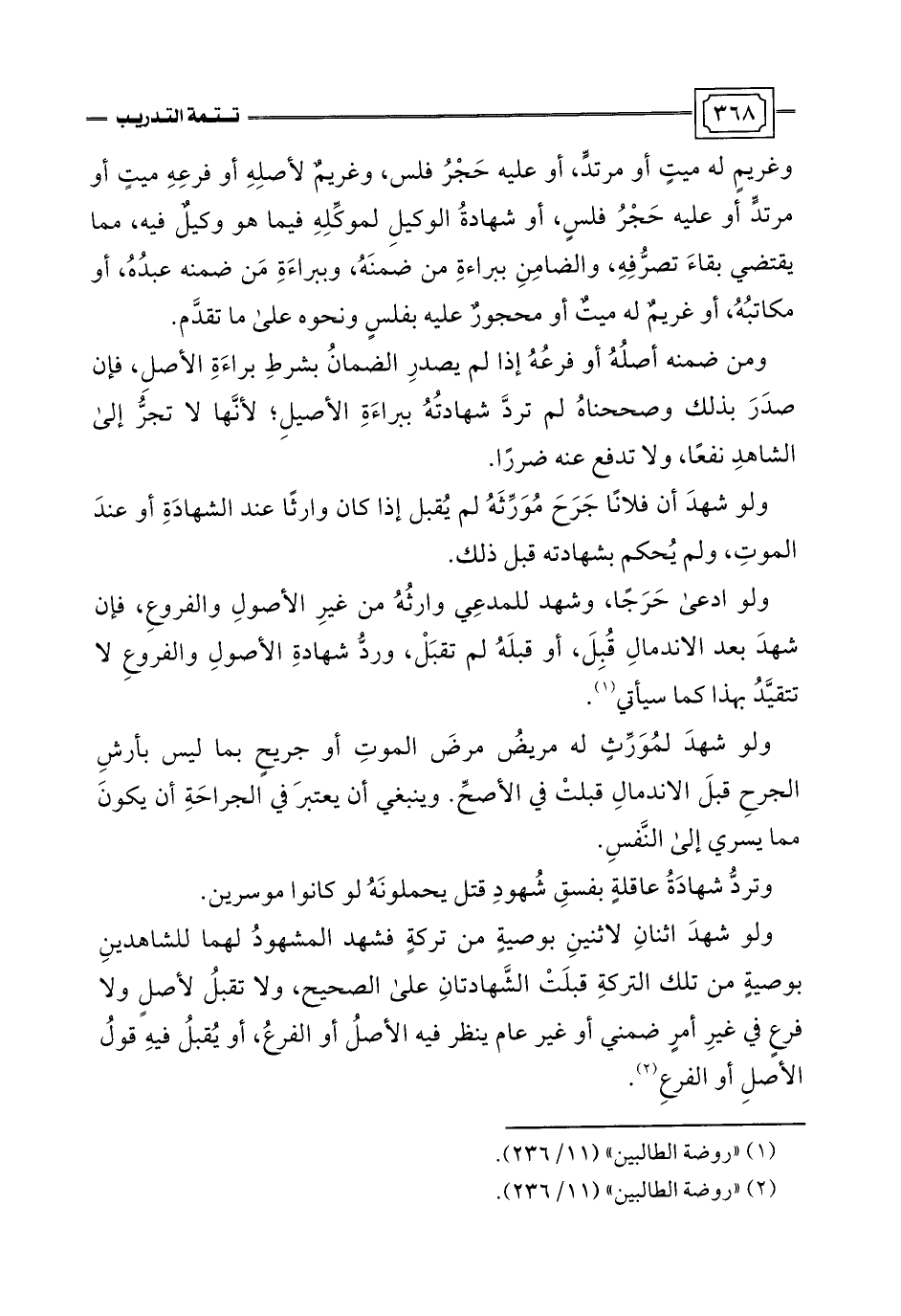 ولو شهدَ اثنانِ لاثنينِ بوصيةٍ من تركةٍ فشهد المشهودُ لهما للشاهدينِ بوصيةٍ من تلك التركةِ قبلَتْ الشَّهادتانِ على الصحيح، ولا تقبلُ لأصلٍ ولا فرعٍ في غيرِ أمرٍ ضمني أو غير عام ينظر فيه الأصلُ أو الفرعُ، أو يُقبلُ فيهِ قولُ الأصلِ أو الفرعِ (¬2).