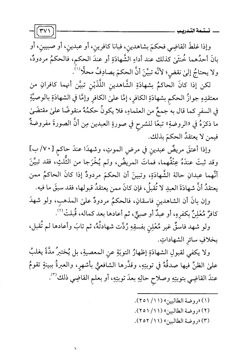 لكن إذا كانَ الحاكمُ بشهادَةِ الشَّاهدينِ اللَّذَيْنِ تبيَّن أنهما كافرانِ من معتقدِهِ جوازُ الحكمِ بشهادَةِ الكافرِ، إمَّا على الكافرِ وإمَّا في الشهادَةِ بالوصيَّةِ في السفرِ كما قال به جمعٌ من العلماءِ، فلا يكونُ حكمُهُ منقوضًا على مقتضى ما ذكرَهُ في "الروضةِ" تبعًا للشرحِ في صورةِ العبدين مِن أنَّ الصورةَ مفروضةٌ فيمن لا يعتقدُ الحكمَ بذلك.