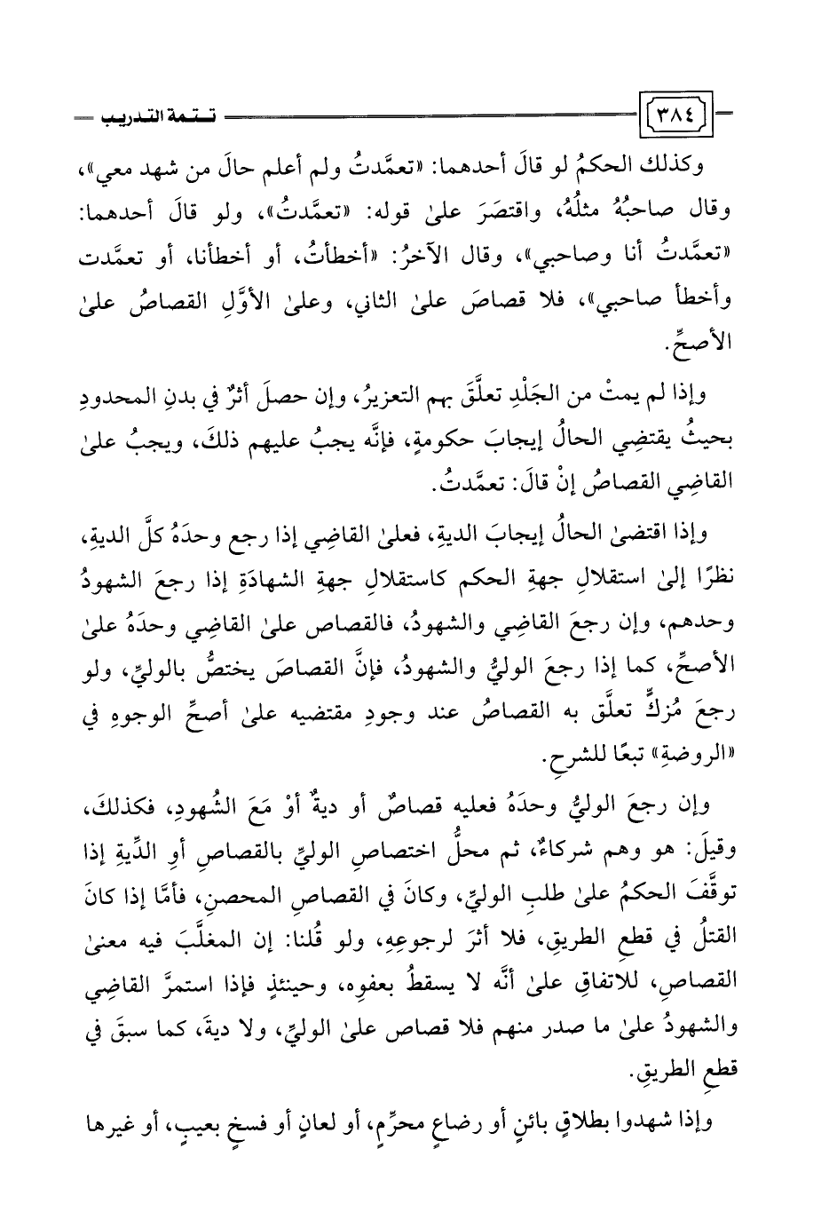 وإذا اقتضى الحالُ إيجابَ الديةِ، فعلى القاضِي إذا رجع وحدَهُ كلَّ الديةِ، نظرًا إلى استقلالِ جهةِ الحكم كاستقلالِ جهةِ الشهادَةِ إذا رجعَ الشهودُ وحدهم، وإن رجعَ القاضِي والشهودُ، فالقصاص على القاضِي وحدَهُ على الأصحِّ، كما إذا رجعَ الوليُّ والشهودُ، فإدنَ القصاصَ يختصُّ بالوليِّ، ولو رجعَ مُزكٍّ تعلَّق به القصاصُ عند وجودِ مقتضيه على أصحِّ الوجوهِ في "الروضةِ" تبعًا للشرحِ.