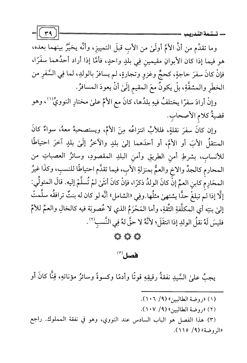 وإن كانَ سفرَ نقلةٍ، فللأبِّ انتزاعُه مِنَ الأمِّ، ويستصحبهُ معهُ، سواءٌ كانَ المنتقلُ الأبَ أو الأمَّ، أو أحدَهما إلى بلدٍ والآخرُ إلَى بلدٍ آخرَ احتياطًا للأنسابِ، بشرطِ أمنِ الطريقِ وأمنِ البلدِ المقصودِ، وسائرُ العصباتِ من المحارمِ كالجدِّ والاخِ والعمُّ بمنزلةِ الأبِ، فيما تقدَّم احتياطًا للنسبِ، وكذَا غيرُ المحَارِمِ كابنِ العمِّ إنْ كانَ الولدُ ذكرًا، فإنْ كانَ أنثَى لمْ تُسلَّمْ إليه. قالَ المتولِّي: إلَّا إذا لم تبلغْ حدًّا يشتهى مثلُها. وفِي "الشامل" أنَّه لو كان له بنت ترافقُه سلِّمتْ إلى بنتِه أي المكلَّفةِ الثِّقةِ، وأما المَحْرَمُ الذي لا عُصوبَة فيه كالخالِ والعمِّ للأمِّ فليسَ لَهُ نقلُ الولدِ إذا انتقَلَ؛ لأنَّهُ لا حقَّ لهُ فِي النَّسبِ (¬2).