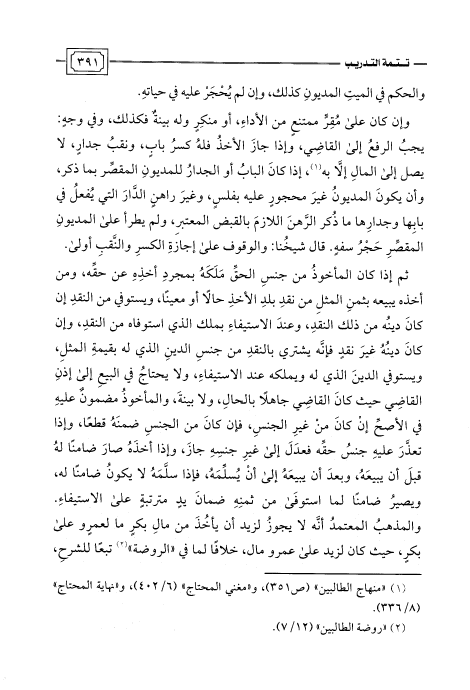 ثم إذا كان المأخوذُ من جنسِ الحقِّ مَلَكَهُ بمجردِ أخذِهِ عن حقِّه، ومن أخذه يبيعه بثمنِ المثلِ من نقدِ بلدِ الأخذِ حالًا أو معينًا، ويستوفي من النقدِ إن كانَ دينُه من ذلك النقدِ، وعندَ الاستيفاءِ بملك الذي استوفاه من النقدِ، وإن كانَ دينُهُ غيرَ نقدٍ فإنَّه يشتري بالنقدِ من جنسِ الدينِ الذي له بقيمةِ المثلِ، ويستوفي الدينَ الذي له ويملكه عند الاستيفاءِ، ولا يحتاجُ بها البيعِ إلى إذنِ القاضِي حيث كانَ القاضِي جاهلًا بالحالِ، ولا بينةَ، والمأخوذُ مضمون عليهِ في الأصحِّ إنْ كانَ منْ غيرِ الجنسِ، فإن كانَ من الجنسِ ضمنَهُ قطعًا، وإذا تعذَّرَ عليهِ جنسُ حقِّه فعدَلَ إلى غيرِ جنسِهِ جازَ، وإذا أخذَهُ صارَ ضامنًا لهُ قبلَ أن يبيعَهُ، وبعدَ أن يبيعَهُ إلى أَنْ يُسلِّمَهُ، فإذا سلَّمَهُ لا يكونُ ضامنًا له، ويصيرُ ضامنًا لما استوفَى من ثمنِهِ ضمانَ يدٍ مترتبةٍ على الاستيفاءِ. والمذهبُ المعتمدُ أنَّه لا يجوزُ لزيد أن يأخُذَ من مالِ بكرٍ ما لعمرٍو على بكرٍ، حيث كان لزيد على عمرو مال، خلافًا لما في "الروضة" (¬2) تبعًا للشرحِ،
