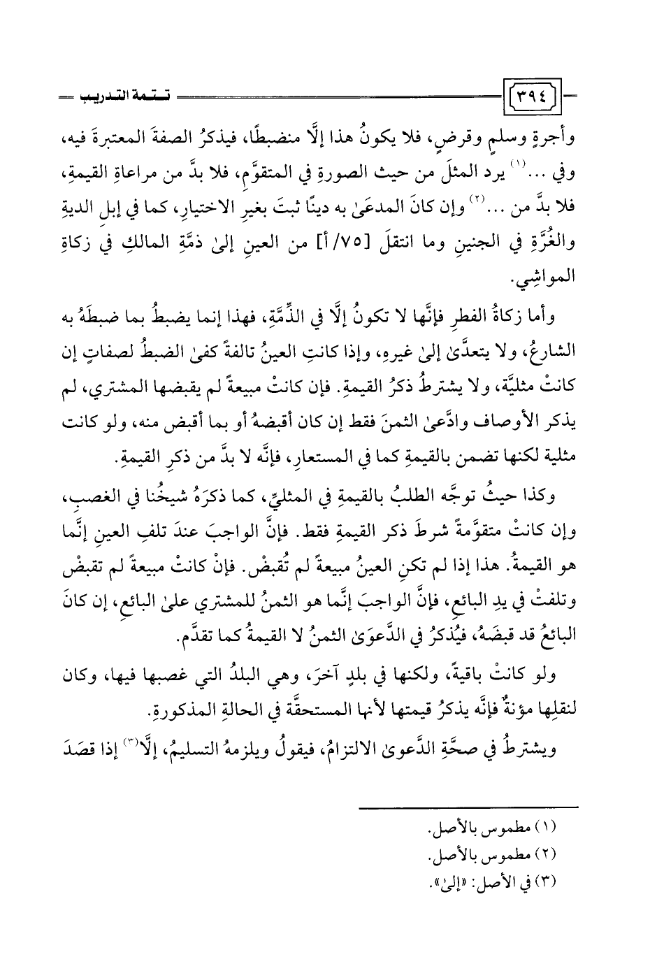 وأجرةٍ وسلمٍ وقرضٍ، فلا يكونُ هذا إلَّا منضبطًا، فيذكرُ الصفةَ المعتبرةَ فيه، وفي. . . (¬1) يرد المثلَ من حيث الصورةِ في المتقوَّمِ، فلا بدَّ من مراعاةِ القيمةِ، فلا بدَّ من. . . (¬2) وإن كانَ المدعَى به دينًا ثبتَ بغيرِ الاختيارِ، كما في إبلِ الديةِ والغُرَّةِ في الجنينِ وما انتقلَ من العينِ إلى ذمَّةِ المالكِ في زكاةِ المواشِي.