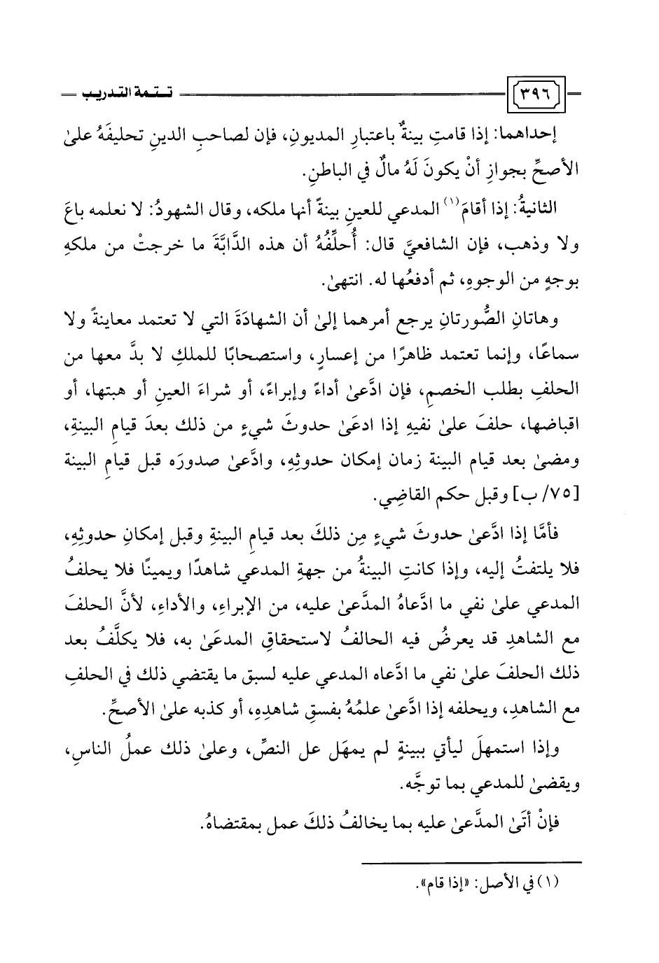 وهاتانِ الصُّورتانِ يرجع أمرهما إلى أن الشهادَةَ التي لا تعتمد معاينةً ولا سماعًا، وإنما تعتمد ظاهرًا من إعسارٍ، واستصحابًا للملكِ لا بدَّ معها من الحلفِ بطلب الخصمِ، فإن ادَّعى أداءً وإبراءً، أو شراءَ العينِ أو هبتها، أو اقباضها، حلفَ على نفيهِ إذا ادعَى حدوثَ شيءٍ من ذلك بعدَ قيامِ البينةِ، ومضى بعد قيام البينة زمان إمكان حدوثِهِ، وادَّعى صدورَه قبل قيامِ البينة وقبل حكم القاضِي.