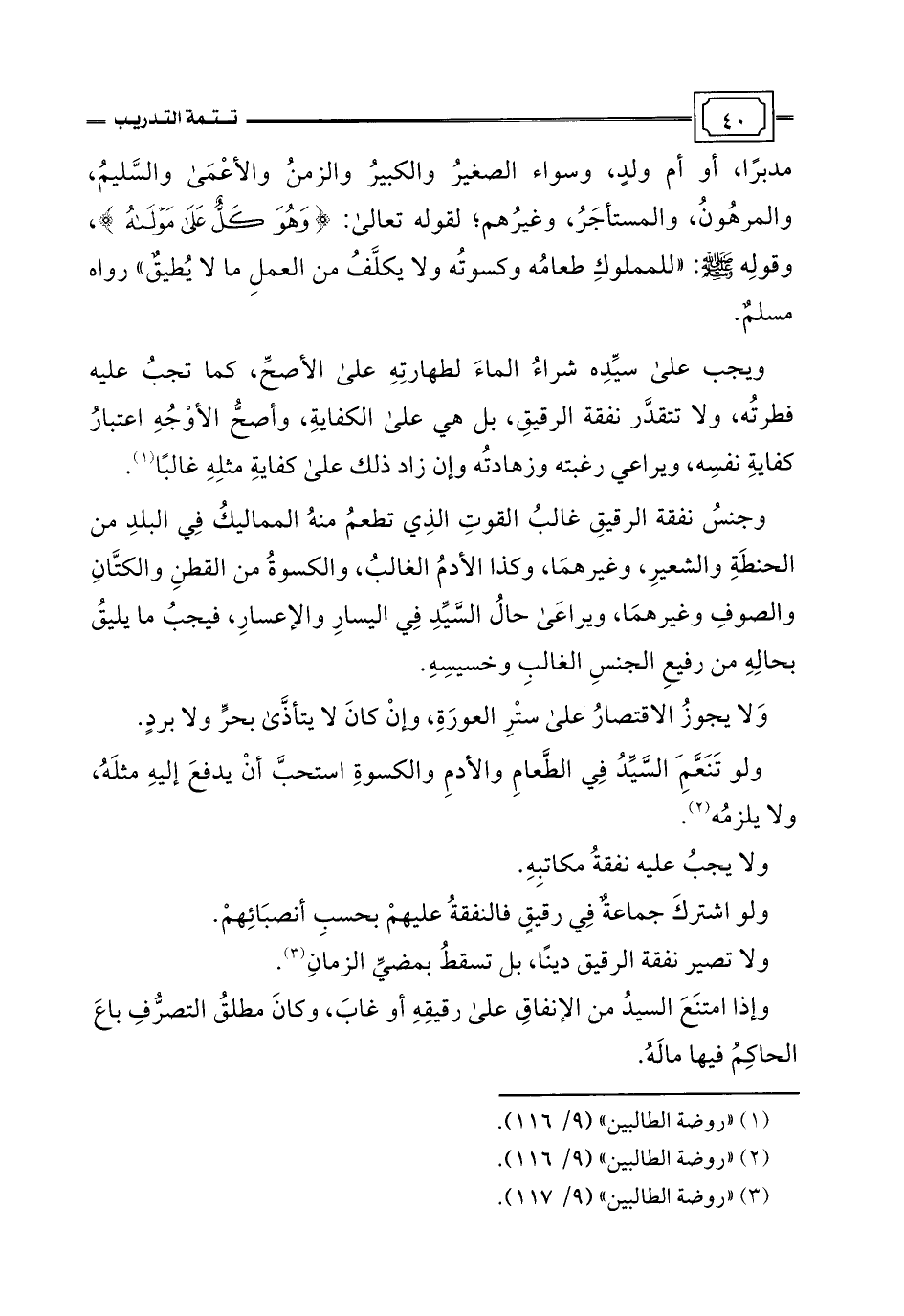 مدبرًا، أو أم ولدٍ، وسواء الصغيرُ والكبيرُ والزمنُ والأعْمَى والسَّليمُ، والمرهُونُ، والمستأجَرُ، وغيرُهم؛ لقوله تعالى: {وَهُوَ كَلٌّ عَلَى مَوْلَاهُ}، وقولِه -صلى اللَّه عليه وسلم-: "للمملوكِ طعامُه وكسوتُه ولا يكلَّفُ من العمل ما لا يُطيق" رواه مسلمٌ.