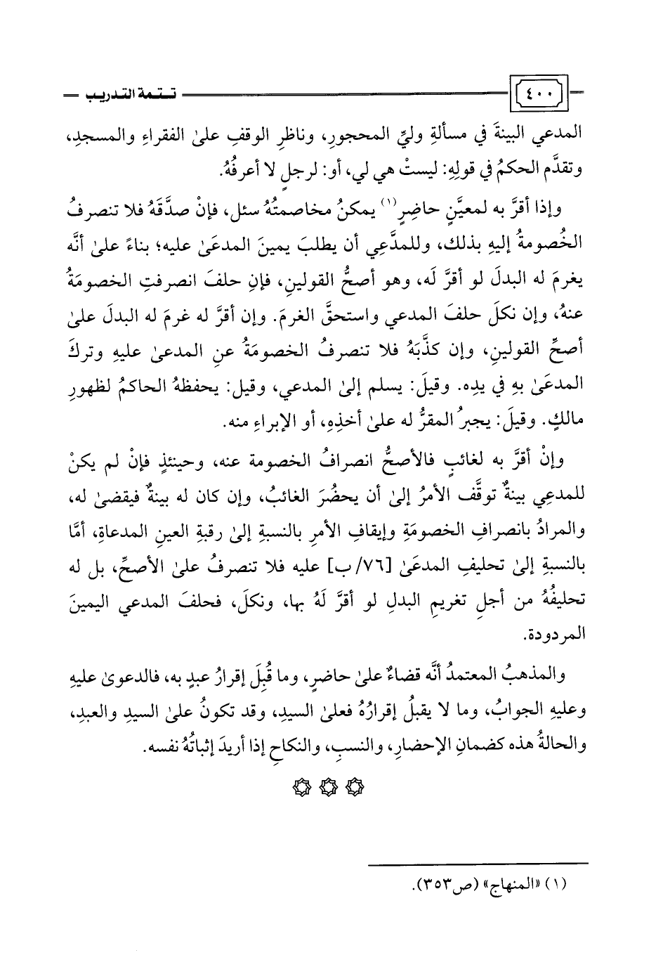 وإنْ أقرَّ به لغائبٍ فالأصحُّ انصرافُ الخصومة عنه، وحينئذٍ فإنْ لم يكنْ للمدعِي بينةٌ توقَّف الأمرُ إلى أن يحضُرَ الغائبُ، وإن كان له بينةٌ فيقضى له، والمرادُ بانصرافِ الخصومَةِ وإيقافِ الأمرِ بالنسبةِ إلى رقبةِ العينِ المدعاةِ، أمَّا بالنسبةِ إلى تحليفِ المدعَى عليه فلا تنصرفُ على الأصحِّ، بل له تحليفُهُ من أجلِ تغريمِ البدلِ لو أقرَّ لَهُ بها، ونكلَ، فحلفَ المدعي اليمينَ المردودة.