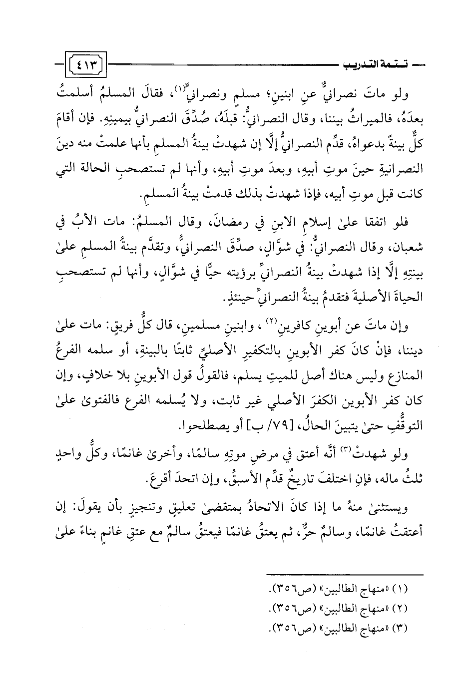 فلو اتفقا على إسلامِ الابنِ بها رمضانَ، وقال المسلمُ: مات الأبُ في شعبان، وقال النصرانيُّ: في شوَّالٍ، صدِّقَ النصرانيُّ، وتقدَّم بينةُ المسلمِ على بينتِهِ إلَّا إذا شهدتْ بينةُ النصرانيِّ برؤيته حيًّا في شوَّالٍ، وأنها لم تستصحبِ الحياةَ الأصليةَ فتقدمُ بينةُ النصرانيِّ حينئذٍ.