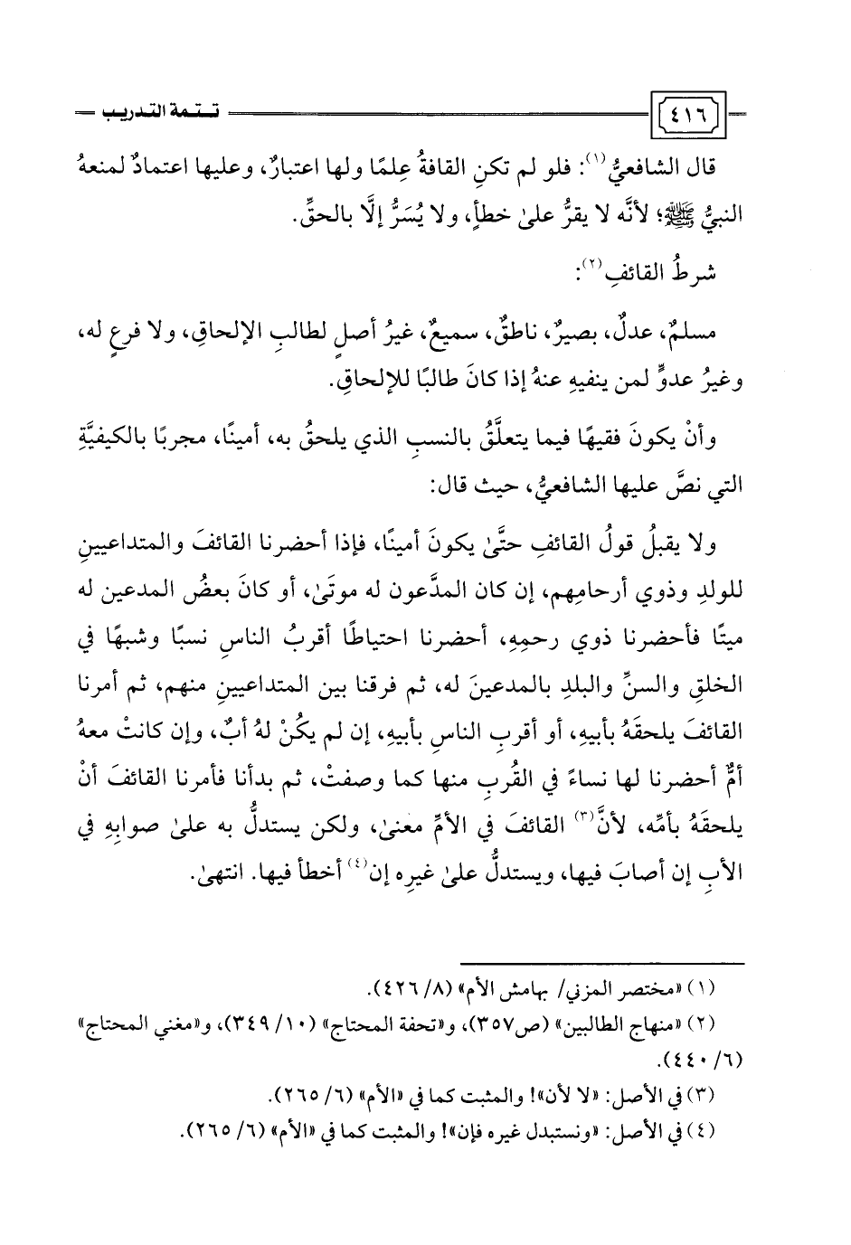 وأنْ يكونَ فقيهًا فيما يتعلَّقُ بالنسبِ الذي يلحقُ به، أمينًا، مجربًا بالكيفيَّةِ التي نصَّ عليها الشافعيُّ، حيث قال: