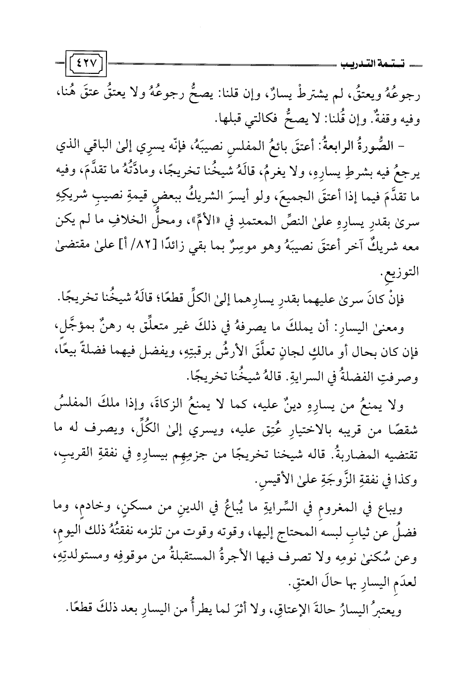 - الصُّورةُ الرابعةُ: أعتقَ بائعُ المفلسِ نصيبَهُ، فإنّه يسرِي إلى الباقي الذي يرجعُ فيه بشرطِ يسارِهِ، ولا يغرمُ، قالَهُ شيخُنا تخريجًا، ومادَّتُهُ ما تقدَّمَ، وفيه ما تقدَّمَ فيما إذا أعتقَ الجميعَ، ولو أيسرَ الشريكُ ببعضِ قيمةِ نصيبِ شريكِهِ سرى بقدرِ يسارِهِ على النصِّ المعتمدِ في "الأمِّ"، ومحلُّ الخلافَ ما لم يكن معه شريكٌ آخر أعتقَ نصيبَهُ وهو موسِر بما بقي زائدًا على مقتضى التوزيعِ.