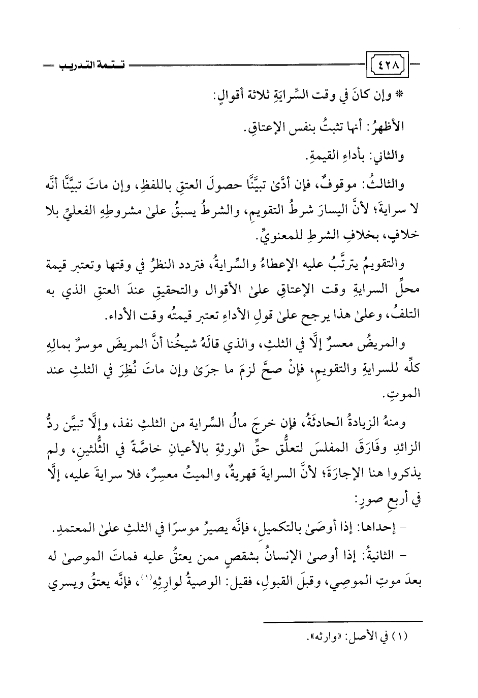 والثالث: موقوفٌ، فإن أدَّى تبيَّنَّا حصولَ العتقِ باللفظِ، وإن ماتَ تبيَّنَّا أنَّه لا سرايةَ؛ لأنَّ اليسارَ شرطُ التقويمِ، والشرطُ يسبقُ على مشروطِهِ الفعليِّ بلا خلافٍ، بخلافِ الشرطِ للمعنويِّ.