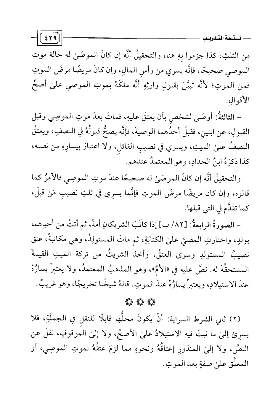 والتحقيقُ أنَّه إن كانَ الموصَى له صحيحًا عندَ موتِ الموصِي فالأمرُ كما قالوه، وإن كان مريضًا مرضَ الموتِ فإنَّما يسرِي في ثلثِ نصيبِ مَن قبلَ، كما تقدَّم في التي قبلها.