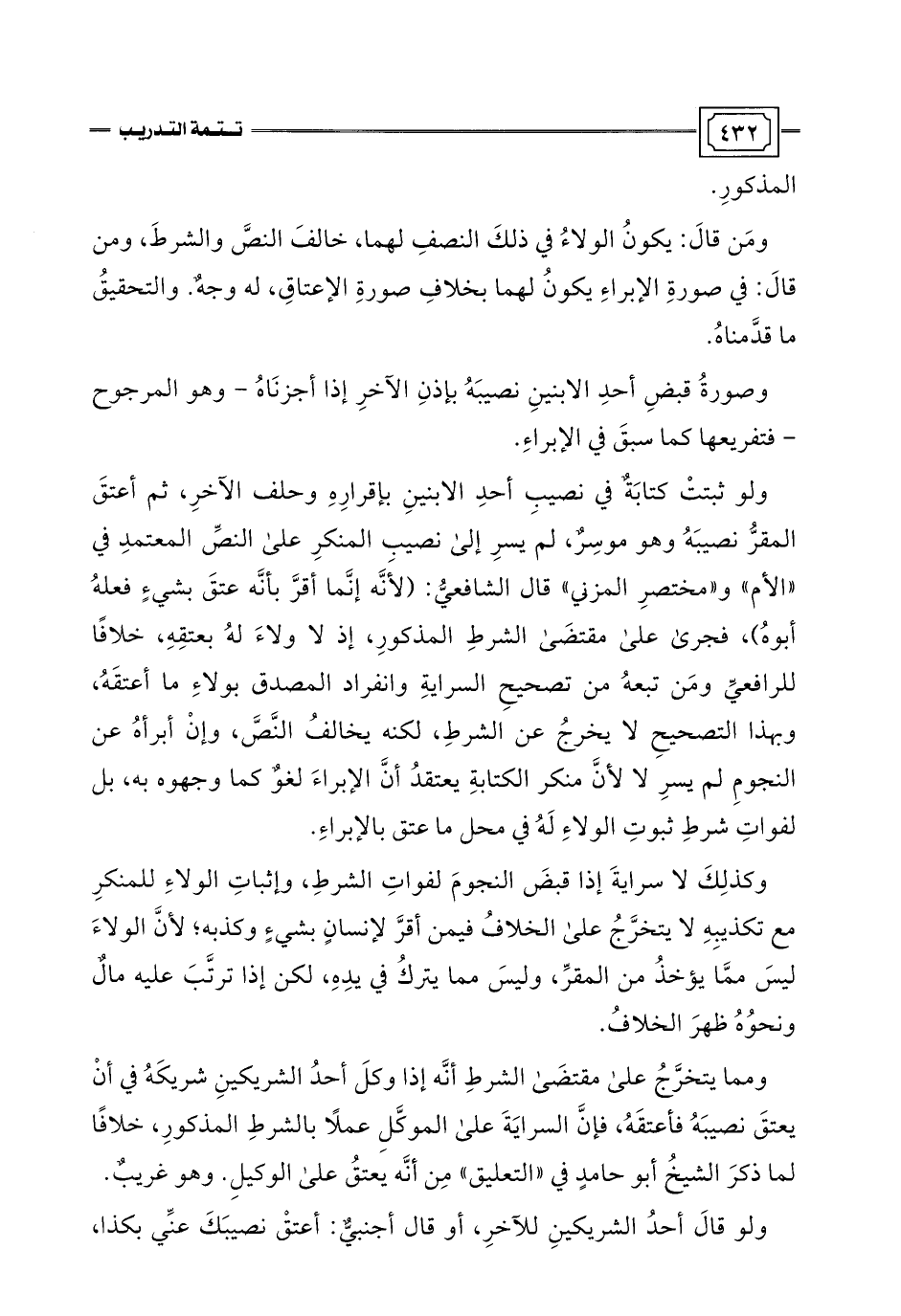 ولو ثبتتْ كتابَة في نصيبِ أحدِ الابنينِ بإقرارِهِ وحلف الآخرِ، ثم أعتقَ المقرُّ نصيبَهُ وهو موسِرٌ، لم يسرِ إلى نصيب المنكرِ على النصِّ المعتمد في "الأم" و"مختصرِ المزني" قال الشافعيُّ: (لأَنَّه إنَّما أقرَّ بأنَّه عتقَ بشيءٍ فعلهُ أبوهُ)، فجرى على مقتضَى الشرطِ المذكورِ، إذ لا ولاءَ لهُ بعتقِهِ، خلافًا للرافعيِّ ومَن تبعهُ من تصحيحِ السرايةِ وانفراد المصدق بولاءِ ما أعتقَهُ، وبهذا التصحيحِ لا يخرجُ عن الشرطِ، لكنه يخالفُ النَّصَّ، وإنْ أبرأهُ عن النجومِ لم يسرِ لا لأنَّ منكر الكتابةِ يعتقدُ أنَّ الإبراءَ لغوٌ كما وجهوه به، بل لفواتِ شرطِ ثبوتِ الولاءِ لَهُ بها محل ما عتق بالإبراءِ.