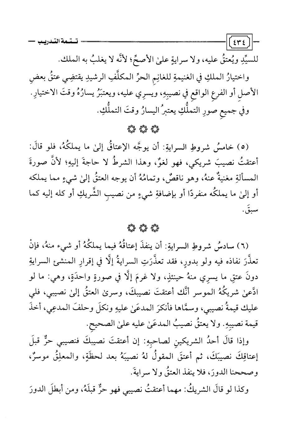 (5) خامسُ شروطِ السرايةِ: أن يوجَّه الإعتاقُ إلى ما يملكُهُ، فلو قالَ: أعتقتُ نصيبَ شريكي، فهو لغوٌ، وهذا الشرطُ لا حاجةَ إليهِ؛ لأنَّ صورةَ المسألةِ مغنيةٌ عنهُ، وهو ناقصٌ، وتمامُهُ أن يوجه العتقُ إلى شيءٍ مما يملكه أو إلى ما يملكُه منفردًا أو بإضافةِ شيءٍ من نصيبِ الشَّريكِ أو كله إليه كما سبقَ.