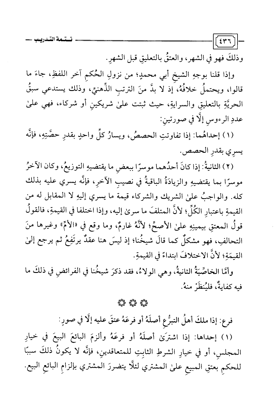 وإذا قلنا بوجهِ الشيخِ أبي محمد؛ من نزولِ الحُكمِ آخر اللفظِ، جاءَ ما قالوا، ويحتملُ خلافُهُ، إذ لا بدَّ منَ الترتبِ الذِّهنيِّ، وذلك يستدعي سبقُ الحريَّةِ بالتعليقِ والسرايةِ، حيث ثبتت على شريكينِ أو شركاء، فهي على عددِ الرءوسِ إلَّا في صورتينِ: