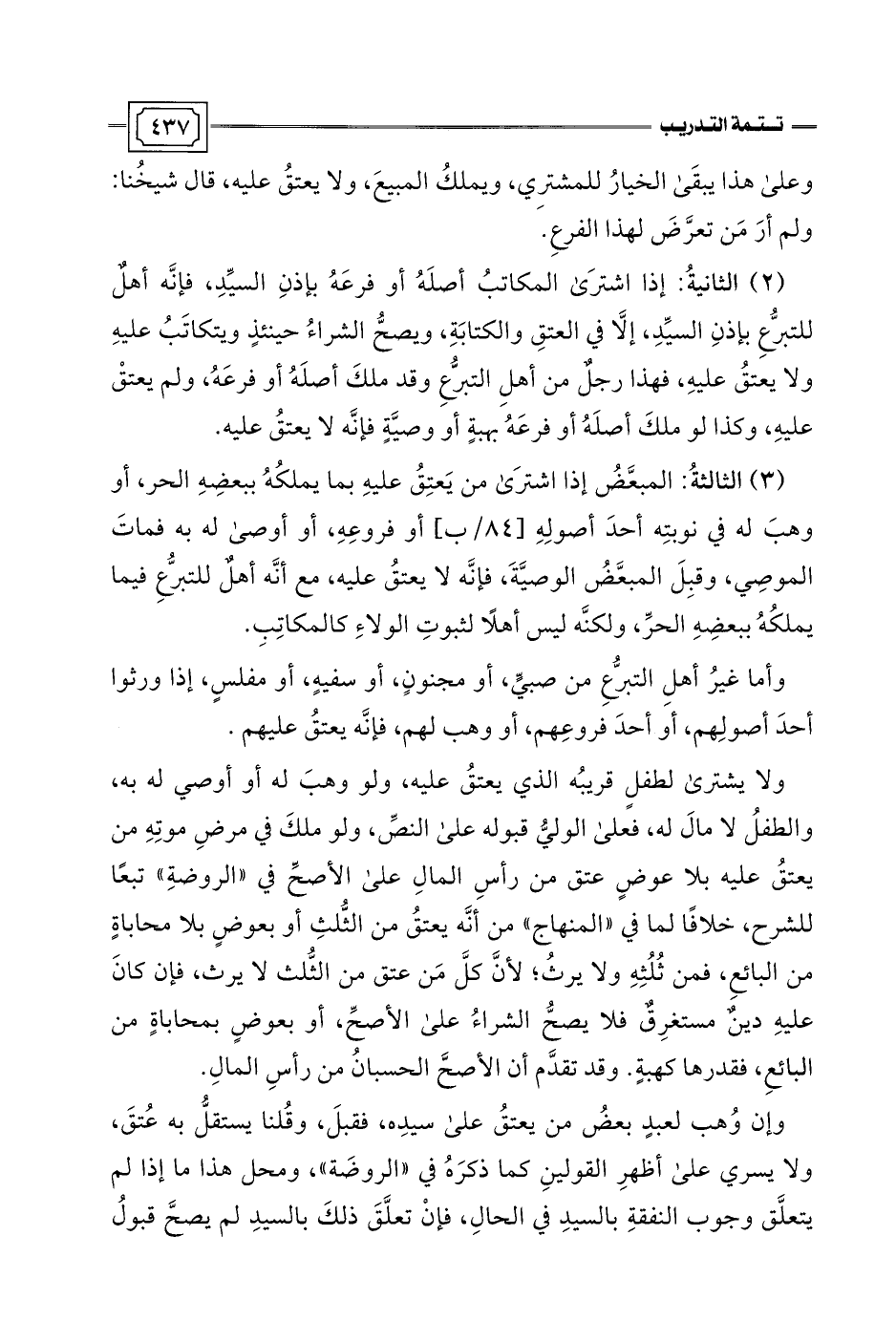 (3) الثالثةُ: المبعَّضُ إذا اشترَى من يَعتِقُ عليه بما يملكُهُ ببعضِهِ الحر، أو وهبَ له في نوبتِه أحدَ أصولِهِ أو فروعِهِ، أو أوصى له به فماتَ الموصِي، وقبِلَ المبعَّضُ الوصيَّةَ، فإنَّه لا يعتقُ عليه، مع أنَّه أهلٌ للتبرُّعِ فيما يملكُهُ ببعضِهِ الحرِّ، ولكنَّه ليس أهلًا لثبوتِ الولاءِ كالمكاتِبِ.