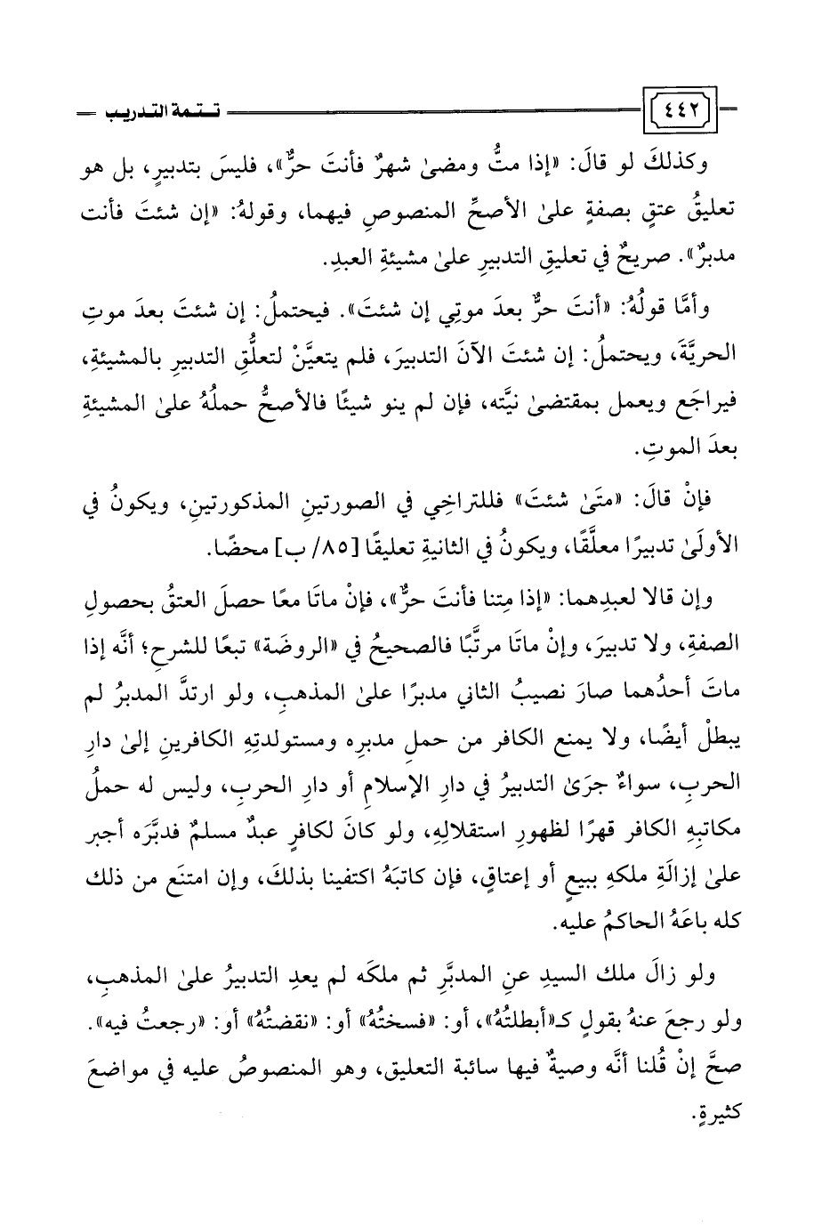 وكذلكَ لو قالَ: "إذا متُّ ومضى شهرٌ فأنتَ حرٌّ"، فليسَ بتدبيرٍ، بل هو تعليقُ عتقٍ بصفةٍ على الأصحِّ المنصوصِ فيهما، وقولهُ: "إن شئتَ فأنت مدبرٌ". صريحٌ في تعليقِ التدبيرِ على مشيئةِ العبدِ.