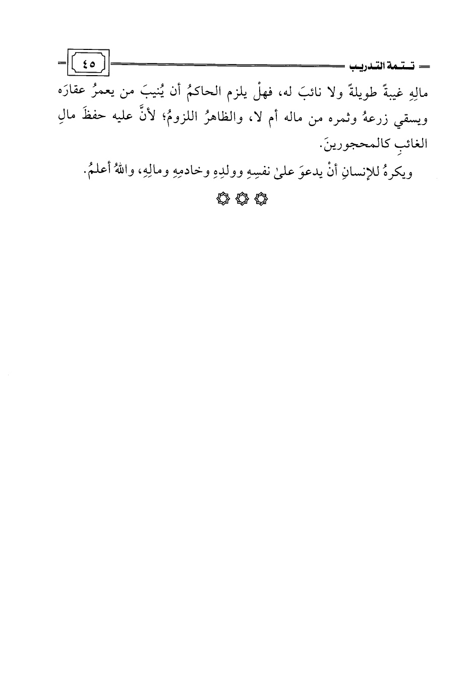 مالِهِ غيبةً طويلةً ولا نائبَ له، فهلْ يلزم الحاكمُ أن يُنيبَ من يعمرُ عقارَه ويسقي زرعهُ وثمره من ماله أم لا، والظاهرُ اللزومُ؛ لأنَّ عليه حفظَ مالِ الغائبِ كالمحجورينَ.