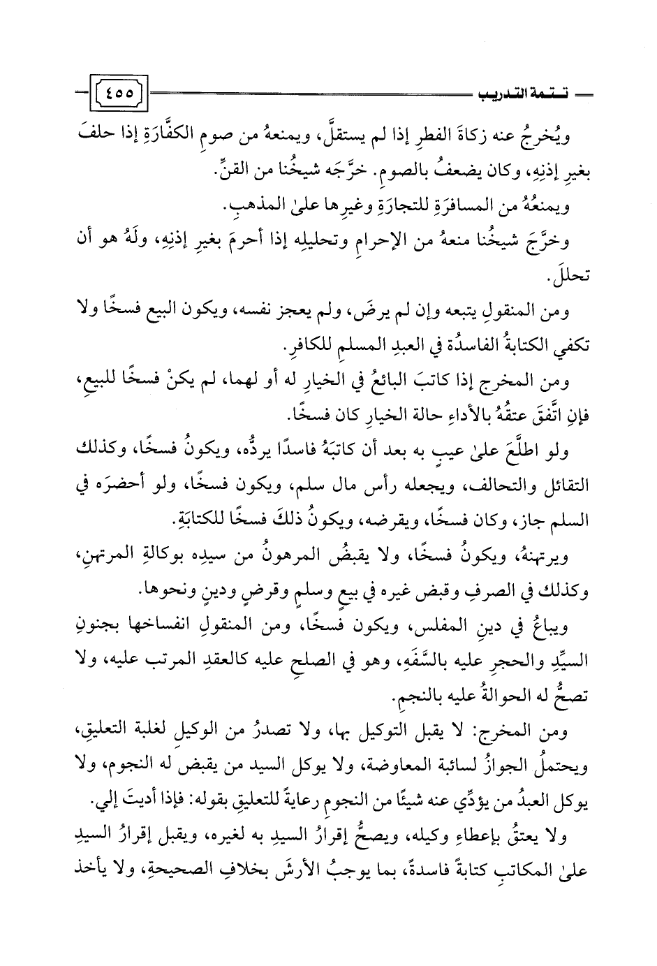 ومن المخرج: لا يقبل التوكيل بها, ولا تصدرُ من الوكيلِ لغلبة التعليقِ، ويحتملُ الجوازُ لسائبة المعاوضة، ولا يوكل السيد من يقبض له النجوم، ولا يوكل العبدُ من يؤدِّي عنه شيئًا من النجومِ رعايةً للتعليقِ بقوله: فإذا أديتَ إلي.