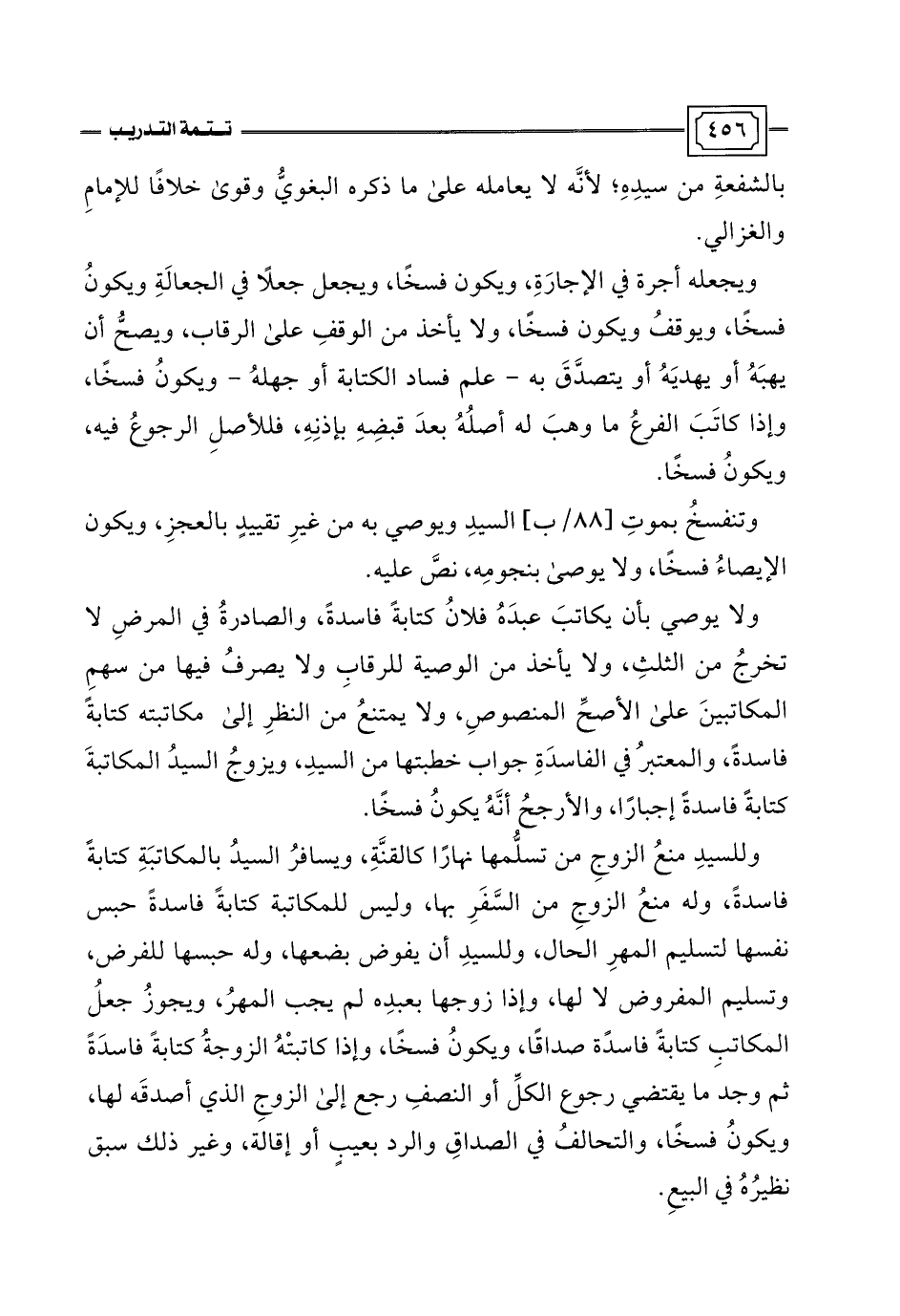 ولا يوصي بأن يكاتبَ عبدَهُ فلانُ كتابةً فاسدةً، والصادرةُ في المرضِ لا تخرجُ من الثلثِ، ولا يأخذ من الوصية للرقابِ ولا يصرفُ فيها من سهمِ المكاتبينَ على الأصحِّ المنصوصِ، ولا يمتنعُ من النظرِ إلى مكاتبته كتابةً فاسدةً، والمعتبرُ في الفاسدَةِ جواب خطبتها من السيدِ، ويزوجُ السيدُ المكاتبةَ كتابةً فاسدةً إجبارًا، والأرجحُ أنَّهُ يكونُ فسخًا.