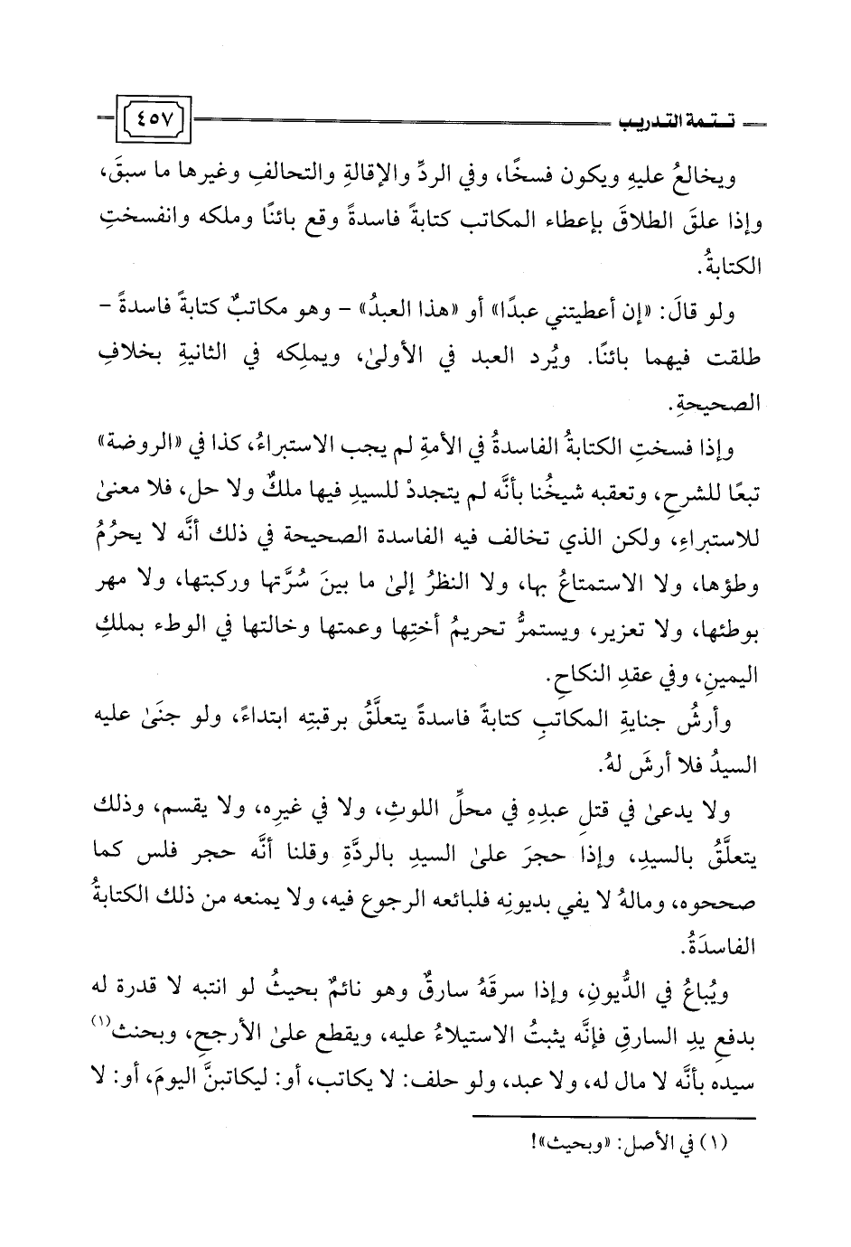 وإذا فسختِ الكتابةُ الفاسدةُ في الأمةِ لم يجب الاستبراءُ، كذا في "الروضة" تبعًا للشرحِ، وتعقبه شيخُنا بأنَّه لم يتجددْ للسيدِ فيها ملكٌ ولا حل، فلا معنى للاستبراءِ، ولكن الذي تخالف فيه الفاسدة الصحيحة في ذلك أنَّه لا يحرُمُ وطؤها, ولا الاستمتاعُ بها, ولا النظرُ إلى ما بينَ سُرَّتها وركبتها, ولا مهر بوطئها, ولا تعزير، ويستمرُّ تحريمُ أختِها وعمتها وخالتها في الوطء بملكِ اليمينِ، وفي عقدِ النكاحِ.