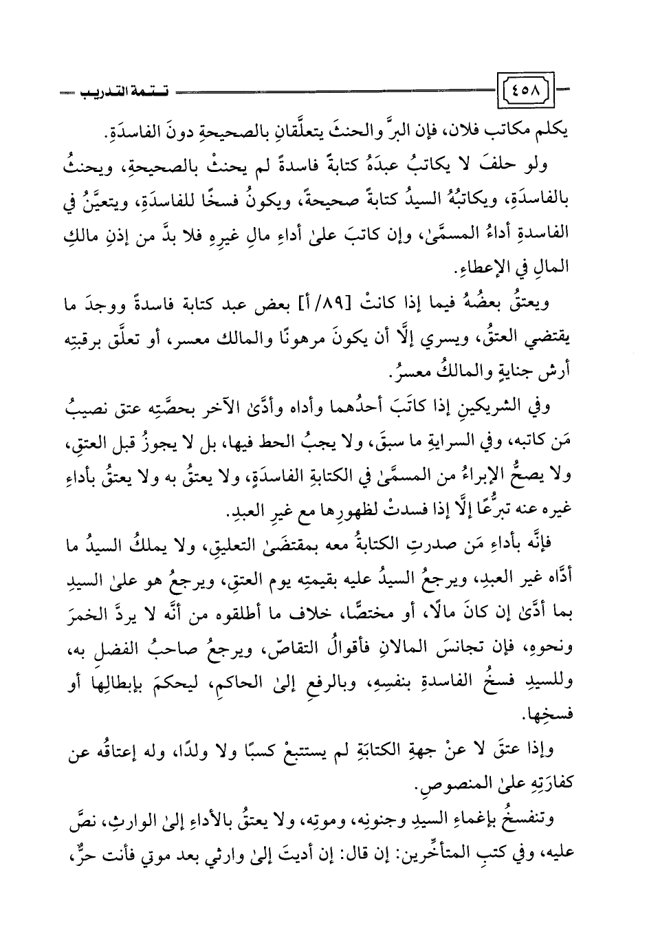 ويعتقُ بعضهُ فيما إذا كانتْ بعض عبد كتابة فاسدةً ووجدَ ما يقتضي العتقُ، ويسري إلَّا أن يكونَ مرهونًا والمالك معسر، أو تعلَّق برقبتِه أرش جنايةٍ والمالكُ معسرُ.