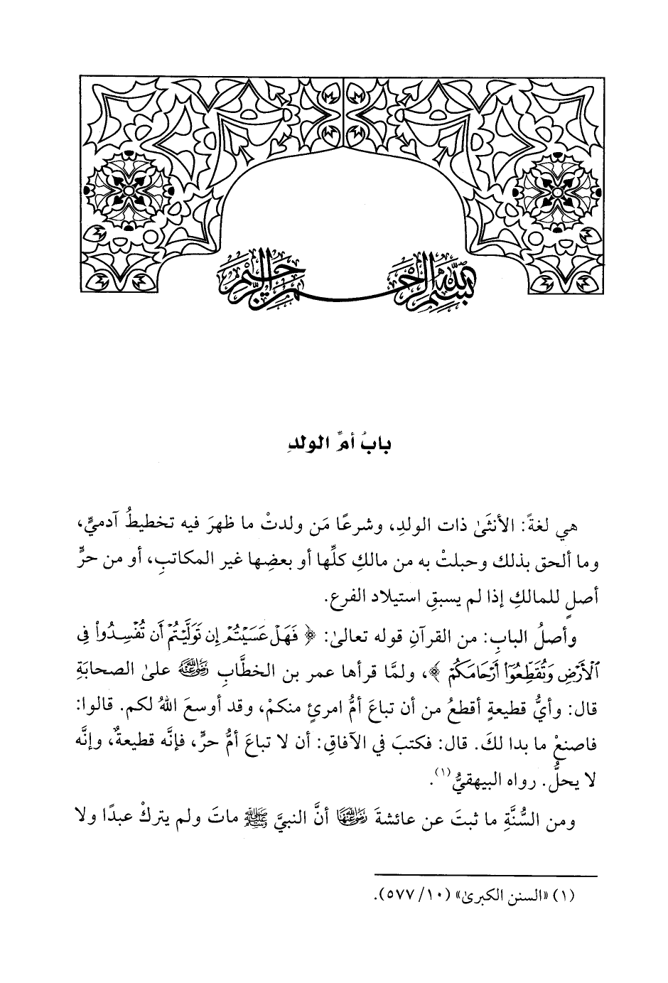 وأصلُ البابِ: من القرآن قوله تعالى: {فَهَلْ عَسَيْتُمْ إِنْ تَوَلَّيْتُمْ أَنْ تُفْسِدُوا فِي الْأَرْضِ وَتُقَطِّعُوا أَرْحَامَكُمْ}، ولمَّا قرأها عمر بن الخطَّابِ -رضي اللَّه عنه- على الصحابَةِ قال: وأيُّ قطيعةٍ أقطعُ من أن تباعَ أمُّ امرئٍ منكمْ، وقد أوسعَ اللَّهُ لكم. قالوا: فاصنعْ ما بدا لكَ. قال: فكتبَ في الآفاقِ: أن لا تباعَ أمُّ حرٍّ، فإنَّه قطيعةٌ، وإنَّه لا يحلُّ. رواه البيهقيُّ (¬1).