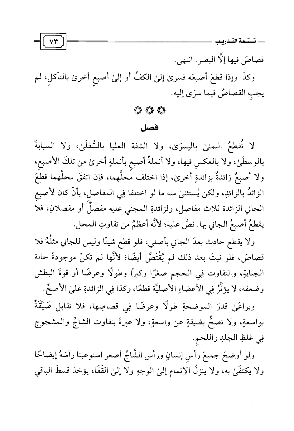لا تُقطعُ اليمنى باليسرَى، ولا الشفة العليا بالسُّفلَى، ولا السبابةَ بالوسطَى، ولا بالعكسِ فيها، ولا أنملةُ أصبعٍ بأنملةٍ أخرى من تلكَ الأصبعِ، ولا أصبعٌ زائدةٌ بزائدةٍ أخرى، إذا اختلف محلَّهما، فإن اتفقَ محلَّهما قطعَ الزائدُ بالزائدِ، ولكن يُستثنى منه ما لو اختلفا فِي المفاصلِ، بأنْ كان لأصبعِ الجاني الزائدة ثلاث مفاصل، ولزائدةِ المجني عليه مفصلٌ أو مفصلانِ، فلا يقطعُ أصبعُ الجاني بها. نصَّ عليه؛ لأنَّه أعظمُ من تفاوتِ المحل.