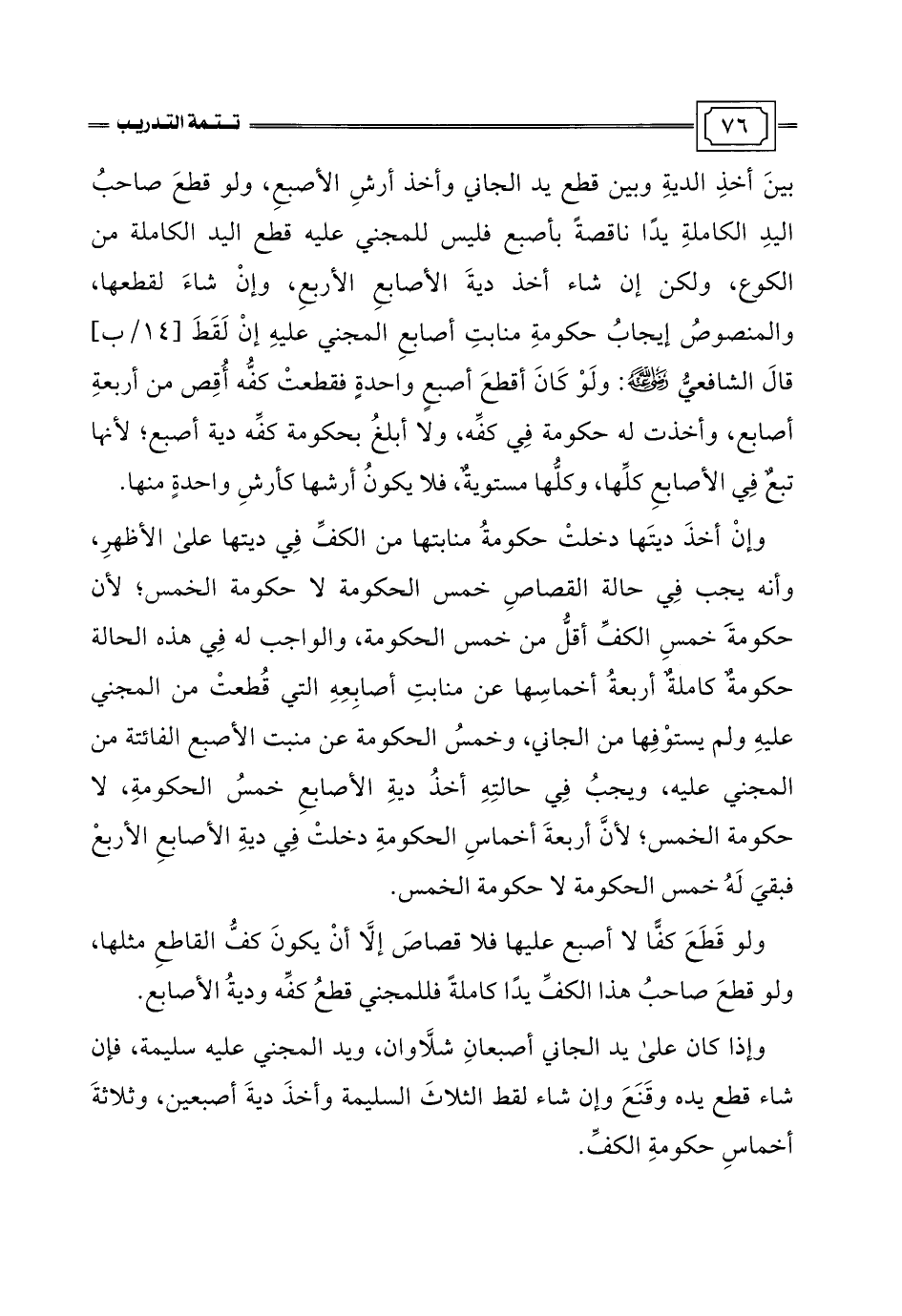 بينَ أخذِ الديةِ وبين قطع يد الجاني وأخذ أرشِ الأصبعِ، ولو قطعَ صاحبُ اليدِ الكاملةِ يدًا ناقصةً بأصبع فليس للمجني عليه قطع اليد الكاملة من الكوع، ولكن إن شاء أخذ ديةَ الأصابعِ الأربعِ، وإنْ شاءَ لقطعها، والمنصوصُ إيجابُ حكومةِ منابتِ أصابعِ المجني عليهِ إنْ لَقَطَ قالَ الشافعيُّ -رضي اللَّه عنه-: ولَوْ كَانَ أقطعَ أصبعٍ واحدةٍ فقطعتْ كفُّه أُقِص من أربعةِ أصابع، وأخذت له حكومة فِي كفِّه، ولا أبلغُ بحكومة كفُّه دية أصبع؛ لأنها تبعٌ فِي الأصابعِ كلها، وكلُّها مستويةٌ، فلا يكونُ أرشها كأرشِ واحدةٍ منها.