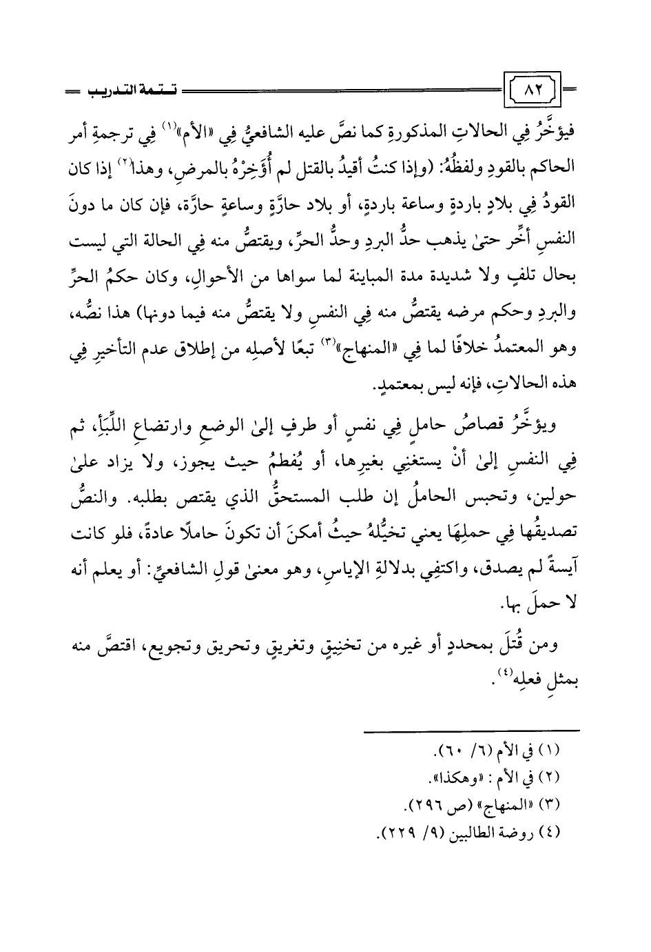 فيؤخَّرُ فِي الحالاتِ المذكورةِ كما نصَّ عليه الشافعيِّ فِي "الأم" (¬1) فِي ترجمةِ أمر الحاكم بالقودِ ولفظُهُ: (وإذا كنتُ أقيدُ بالقتل لم أُؤَخِرْهُ بالمرضِ، وهذا (¬2) إذا كان القودُ فِي بلادٍ باردةٍ وساعة باردةٍ، أو بلاد حارَّةٍ وساعةٍ حارَّة، فإن كان ما دونَ النفسِ أخِّر حتَّى يذهب حدُّ البردِ وحدُّ الحرِّ، ويقتصُّ منه فِي الحالة التي ليست بحال تلفٍ ولا شديدة مدة المباينة لما سواها من الأحوالِ، وكان حكمُ الحرِّ والبردِ وحكم مرضه يقتصُّ منه فِي النفسِ ولا يقتصُّ منه فيما دونها) هذا نصُّه، وهو المعتمدُ خلافًا لما فِي "المنهاج" (¬3) تبعًا لأصلِه من إطلاق عدم التأخيرِ فِي هذه الحالاتِ، فإنَّه ليس بمعتمدٍ.