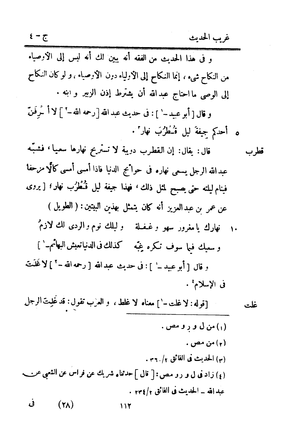 قطرب وَقَالَ [أَبُو عبيد -] : فِي حَدِيث عبد الله [رَحمَه الله -] لَا أعْرِفَنّ أحدكُم جِيفة ليل قُطُرَب نَهَار. قَالَ: يُقَال: إِن القطرب دويبة لَا تستريح نَهَارهَا سعيا فشبّه عبد الله الرجل الَّذِي يسْعَى نَهَاره فِي حوائج الدُّنْيَا فَإِذا أَمْسَى أَمْسَى كالًّا مزحفا فينام ليلته حَتَّى يصبح لمثل ذَلِك فَهَذَا جيفة ليل قُطْرُب نَهَار [يرْوى عَن عمر بن عبد الْعَزِيز أَنه كَانَ يتَمَثَّل بِهَذَيْنِ الْبَيْتَيْنِ: (الطَّوِيل)