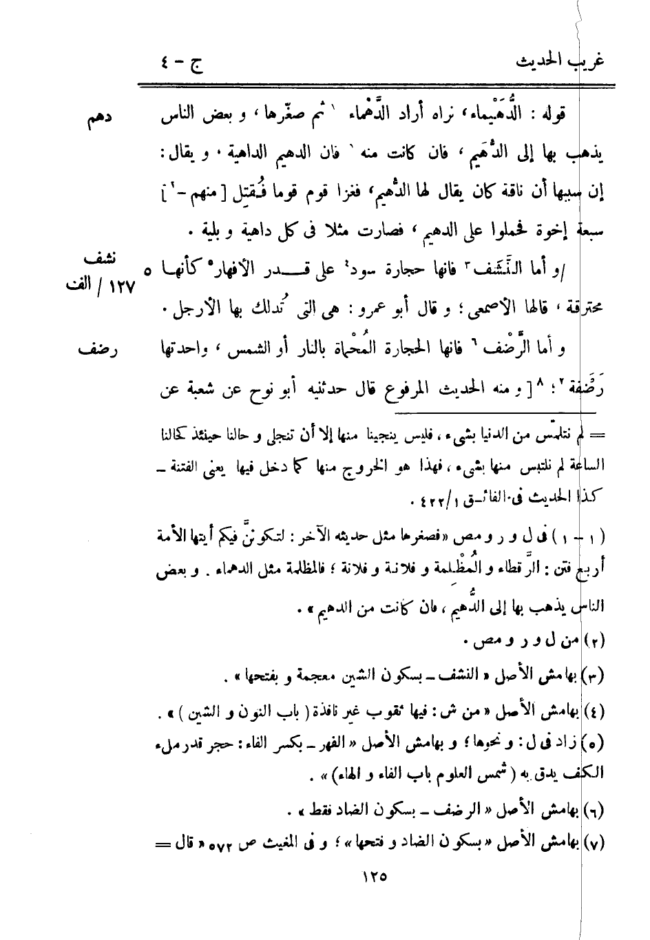 قَوْله: الدُّهَيْماء نرَاهُ أَرَادَ الدَّهْماء ثمَّ صغّرها وَبَعض النَّاس يذهب بهَا إِلَى الدُّهَيم فَإِن كَانَت مِنْهُ فَإِن الدهيم الداهية وَيُقَال: إِن سَببهَا أَن نَاقَة كَانَ يُقَال لَهَا الدُّهيم فغزا قوم قوما فقُتِل [مِنْهُم -] سَبْعَة إخْوَة فحملوا على الدهيم فَصَارَت مثلا فِي كل داهية وبلية. / وَأما النَّشَف فَإِنَّهَا حِجَارَة سود على قدر الأفهار كَأَنَّهَا 7 / الف محترقة قَالَهَا الْأَصْمَعِي: وَقَالَ أَبُو عَمْرو: هِيَ الَّتِي تُدلك بهَا الأرجل. وَأما الرَّضْف فَإِنَّهَا الْحِجَارَة المُحْماة بالنَّار أَو الشَّمْس واحدتها رَضْفَة [وَمِنْه الحَدِيث الْمَرْفُوع قَالَ حَدَّثَنِيهِ أَبُو نوح عَن شُعْبَة عَن