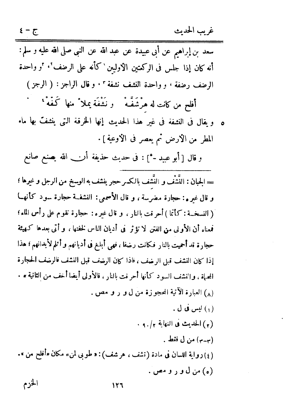 سعد بن إِبْرَاهِيم عَن أبي عُبَيْدَة عَن عبد الله عَن النَّبِيّ صلي الله عَلَيْهِ وَسلم: أَنه كَانَ إِذا جلس فِي الرَّكْعَتَيْنِ الْأَوليين كَأَنَّهُ على الرضف وَوَاحِدَة الرضف رضفة وَوَاحِدَة النشف نشفة وَقَالَ الراجز: (الرجز)