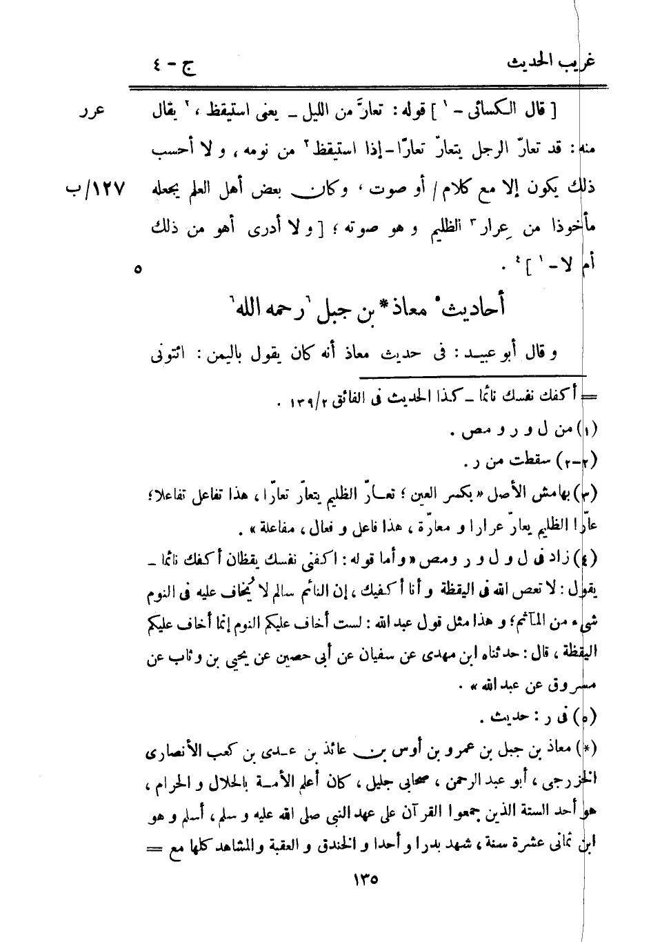 [قَالَ الْكسَائي -] قَوْله: تعارَّ من اللَّيْل يَعْنِي اسْتَيْقَظَ يُقَال مِنْهُ: قد تعارّ الرجل يتعارّ تعارّا إِذا اسْتَيْقَظَ من نَومه وَلَا أَحسب ذَلِك يكون إِلَّا مَعَ كَلَام / أوصوت وَكَانَ بعض أهل الْعلم يَجعله 7 / ب مأخوذا من عِرار الظليم وَهُوَ صَوته [وَلَا أَدْرِي أهوَ من ذَلِك أم لَا -] .