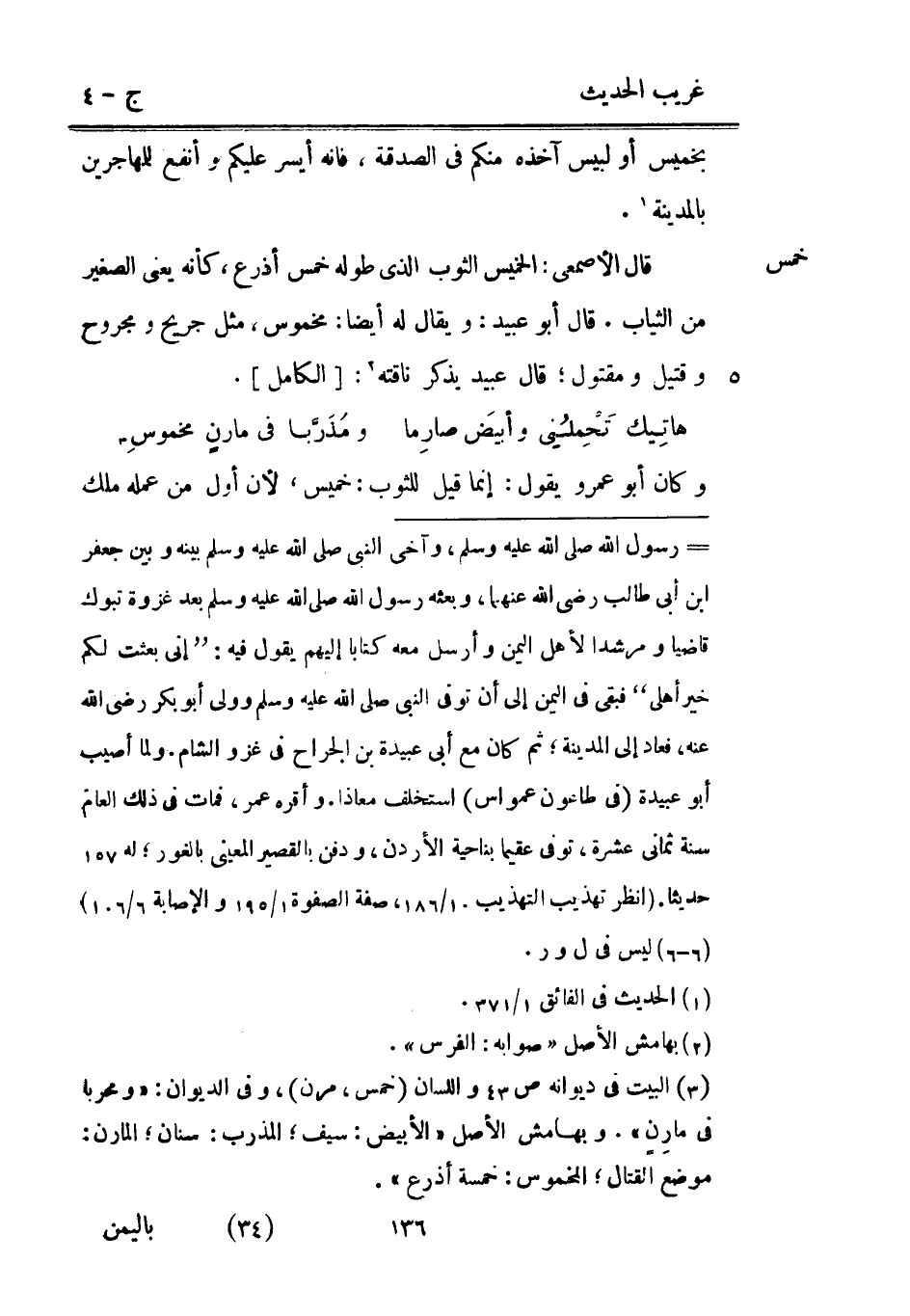 بخميس أَو لبيس آخذه مِنْكُم فِي الصَّدَقَة فَإِنَّهُ أيسر عَلَيْكُم وأنفع للمهاجرين بِالْمَدِينَةِ. قَالَ الْأَصْمَعِي: الْخَمِيس الثَّوْب الَّذِي طوله خمس أَذْرع كَأَنَّهُ يَعْنِي الصَّغِير من الثِّيَاب. قَالَ أَبُو عبيد: وَيُقَال لَهُ أَيْضا: مخموس مثل جريح ومجروح وقتيل ومقتول قَالَ عبيد يذكر نَاقَته: [الْكَامِل] . ... هاتِيك تَحْمِلُنِي وأبيضَ صارِما ... ومُذَرَّبا فِي مارنٍ مخموسِ