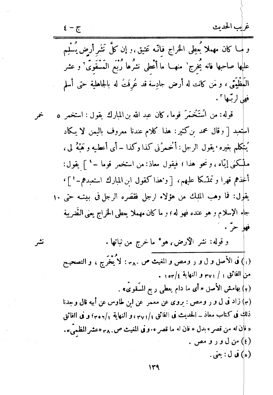 وَمَا كَانَ مهملا يُعطِي الْخراج فإنّه عَتيق وَإِن كلَّ نَشْرِ أرضٍ يُسْلِم عَلَيْهَا صَاحبهَا فَإِنَّهُ يُخرِج مِنْهَا مَا أعْطِى نشُرها رُبْعَ المَسْقَوِيّ وَعشر المَظْمَئ (المَظْمِئ) ومَن كَانَت لَهُ أَرض جادِسة قد عُرِفَتْ لَهُ بالجاهلية حَتَّى أسلم فَهِيَ لربّها. قَوْله: من اسْتَخْمَرَ قوما كَانَ عبد الله بن الْمُبَارك يَقُول: استخمر استعبد [وَقَالَ مُحَمَّد بن كثير: هَذَا كَلَام عندنَا مَعْرُوف بِالْيمن لَا يكَاد يُتكلم بِغَيْرِهِ يَقُول الرجل: أخْمرْني كَذَا وَكَذَا أَي أعْطِيه وهَبْهُ لي ملّكني إيّاه وَنَحْو هَذَا فَيَقُول معَاذ: من استخمر قوما -] يَقُول: أَخذهم قهرا وتملّكا عَلَيْهِم [وَهَذَا كَقَوْل ابْن الْمُبَارك استعبدهم -] يَقُول: فَمَا وهب الملِك من هَؤُلَاءِ لرجل فقصَره الرجل فِي بَيته حَتَّى جَاءَ الْإِسْلَام وَهُوَ عِنْده فَهُوَ لَهُ وَمَا كَانَ مهملا يُعْطي الْخراج يَعْنِي الضَّريبة فَهُوَ حرّ. وَقَوله: نشر الأَرْض هُوَ مَا خرج من نباتها.