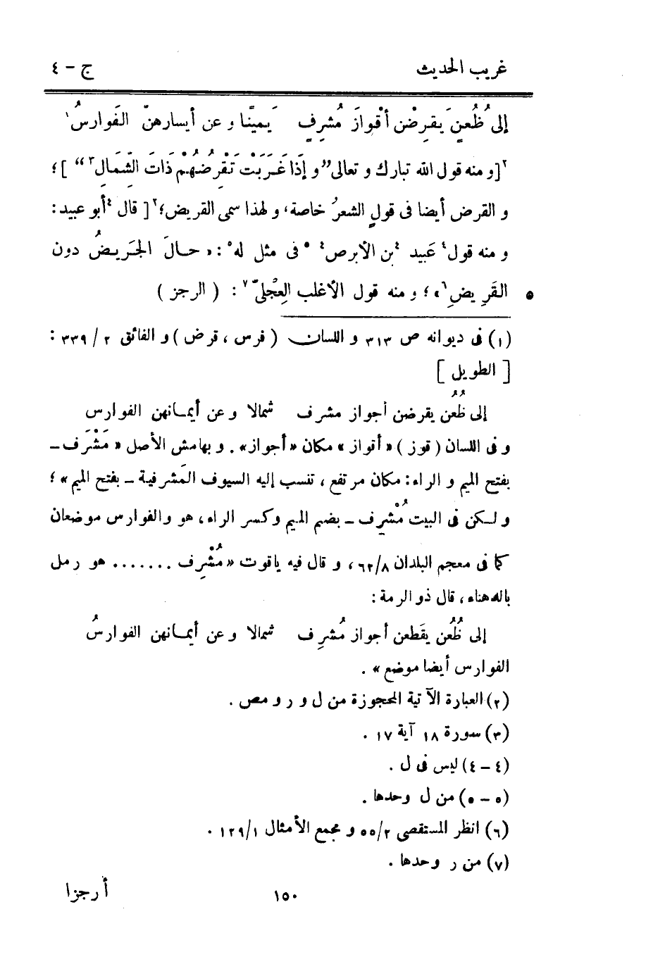 [وَمِنْه قَول الله تبَارك وَتَعَالَى {وإذاَ غَرَبَتْ تَقْرِضُهُمْ ذَاتَ الشّمَالِ} ] وَالْقَرْض أَيْضا فِي قولٍ الشعرُ خَاصَّة وَلِهَذَا سمي القريض [قَالَ أَبُو عبيد: وَمِنْه قَول عَبيد بن الأبرص فِي مثل لَهُ: حالَ الجَريضُ دون القَرِيضِ وَمِنْه قَول الْأَغْلَب الْعجلِيّ: (الرجز)