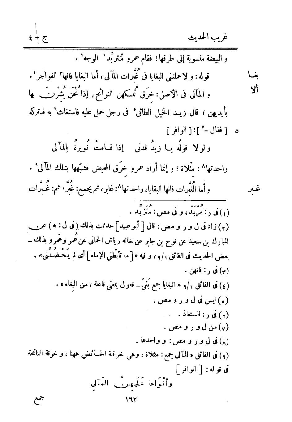 والبيضة منسوبة إِلَى طرقها فَقَامَ عَمْرو مُتربِّد الْوَجْه. قَوْله: وَلَا حَملتنِي البَغايا فِي غُبَّرات المآلي أما البغايا فَإِنَّهَا الفواجر. والمآلي فِي الأَصْل: خِرَق تُمسكهن النوائح إِذا نُحْنَ يُشْرِنَ بهَا بأيديهن قَالَ زيد الْخَيل الطَّائِي فِي رجل حمل عَلَيْهِ فاستغاث بِهِ فَتَركه [فَقَالَ -] : [الوافر]