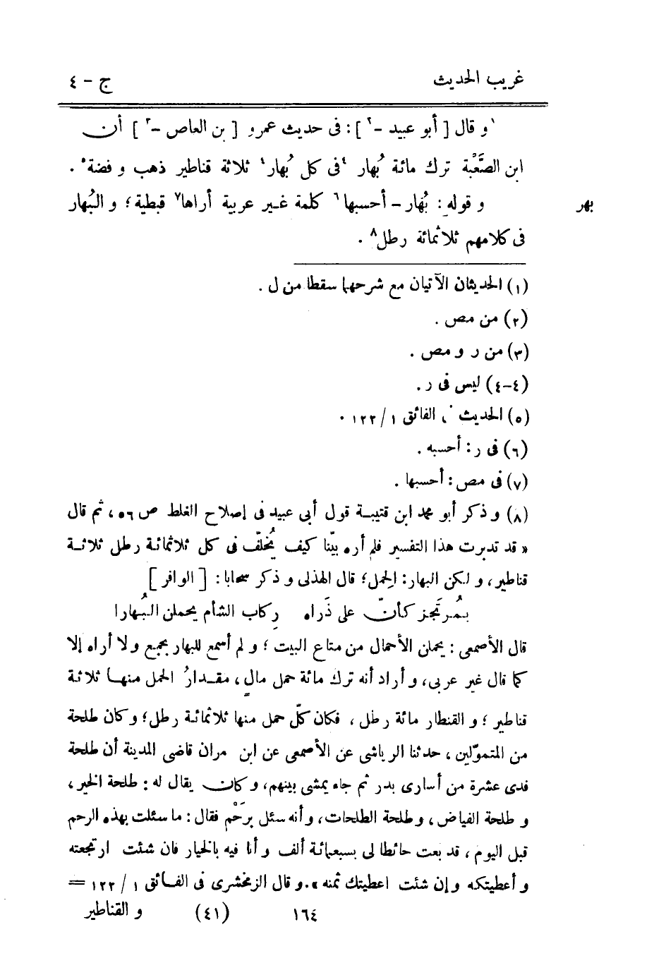 بهر قنطر وَقَالَ [أَبُو عبيد -] : فِي حَدِيث عَمْرو [بن الْعَاصِ -] أَن ابْن الصَّعْبة ترك مائَة بُهار فِي كل بُهار ثَلَاثَة قناطير ذهب وَفِضة. وَقَوله: بُهار أحسبها كلمة غير عَرَبِيَّة أَرَاهَا قبطية والبُهار فِي كَلَامهم ثَلَاثمِائَة رَطْل.
