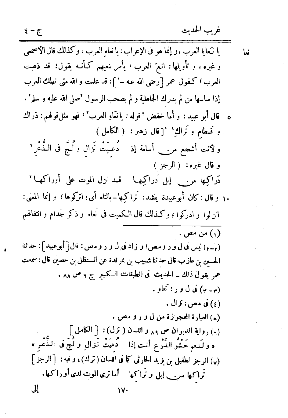 وَقَالَ: كَانَ أَبُو عُبَيْدَة ينشد: تَراكِها بِالتَّاءِ أَي: اتركوها وَإِنَّمَا الْمَعْنى: انزلوا وادركوا وَكَذَلِكَ قَالَ الْكُمَيْت فِي نَعاء وَذكر جذام وانتقالهم