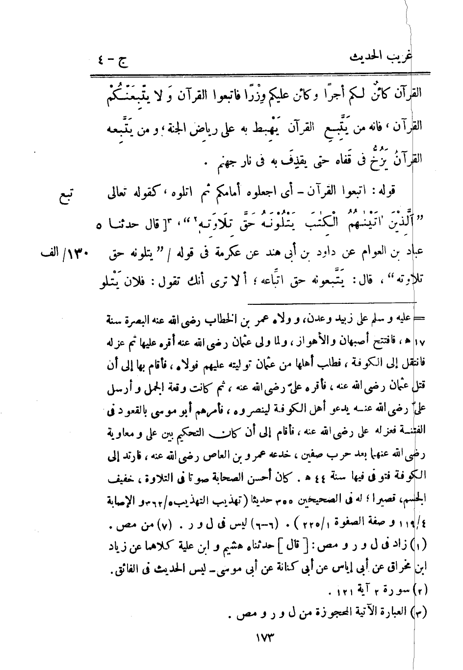 الْقُرْآن كائنٌ لكم أجرا وكائن عَلَيْكُم وِزْرًا فاتبعوا الْقُرْآن وَلا يتّبِعَنّكُمْ الْقُرْآن فَإِنَّهُ من يَتَّبِع الْقُرْآن يَهْبِط بِهِ على رِياض الْجنَّة وَمن يَتَّبِعه القرآنُ يَزُخُّ فِي قَفاه حَتَّى يقذِفَ بِهِ فِي نَار جَهَنَّم. قَوْله: اتبعُوا الْقُرْآن أَي اجعلوه أمامكم ثمَّ اُتْلُوهُ كَقَوْلِه تَعَالَى {الَّذِيْنَ آتَيْنَاهُمُ الْكتاب يتلونه حق تِلاَوَتِه} [قَالَ حَدثنَا عباد بن الْعَوام عَن دَاوُد بن أبي هِنْد عَن عِكْرِمَة فِي قَوْله / {يتلونه حق تِلَاوَته} قَالَ: يَتَّبعونه حق اتِّباعه أَلا ترى أَنَّك تَقول: فلَان يَتْلُو