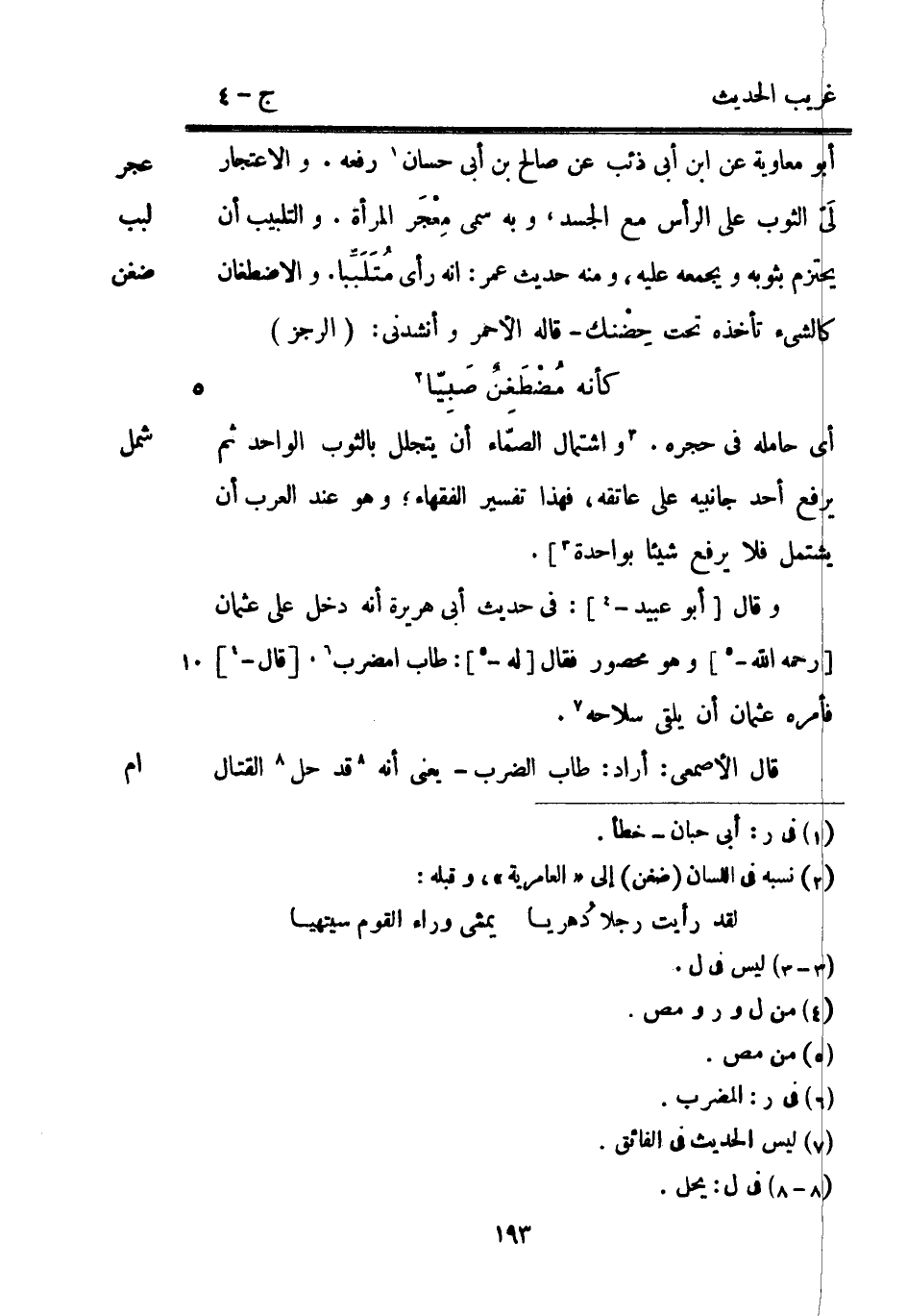 أَبُو مُعَاوِيَة عَن ابْن أبي ذِئْب عَن صَالح بن أبي حسان رَفعه. والاعتجار لَيّ الثَّوْب على الرَّأْس مَعَ الْجَسَد وَبِه سمي مِعْجَر الْمَرْأَة. والتلبيب أَن يحتزم بِثَوْبِهِ ويجمعه عَلَيْهِ وَمِنْه حَدِيث عمر: أَنه رأى مُتَلَبِّبا. والاضطغان كالشيء تَأْخُذهُ تَحت حِضْنك قَالَه الْأَحْمَر وأنشدني: (الرجز)
