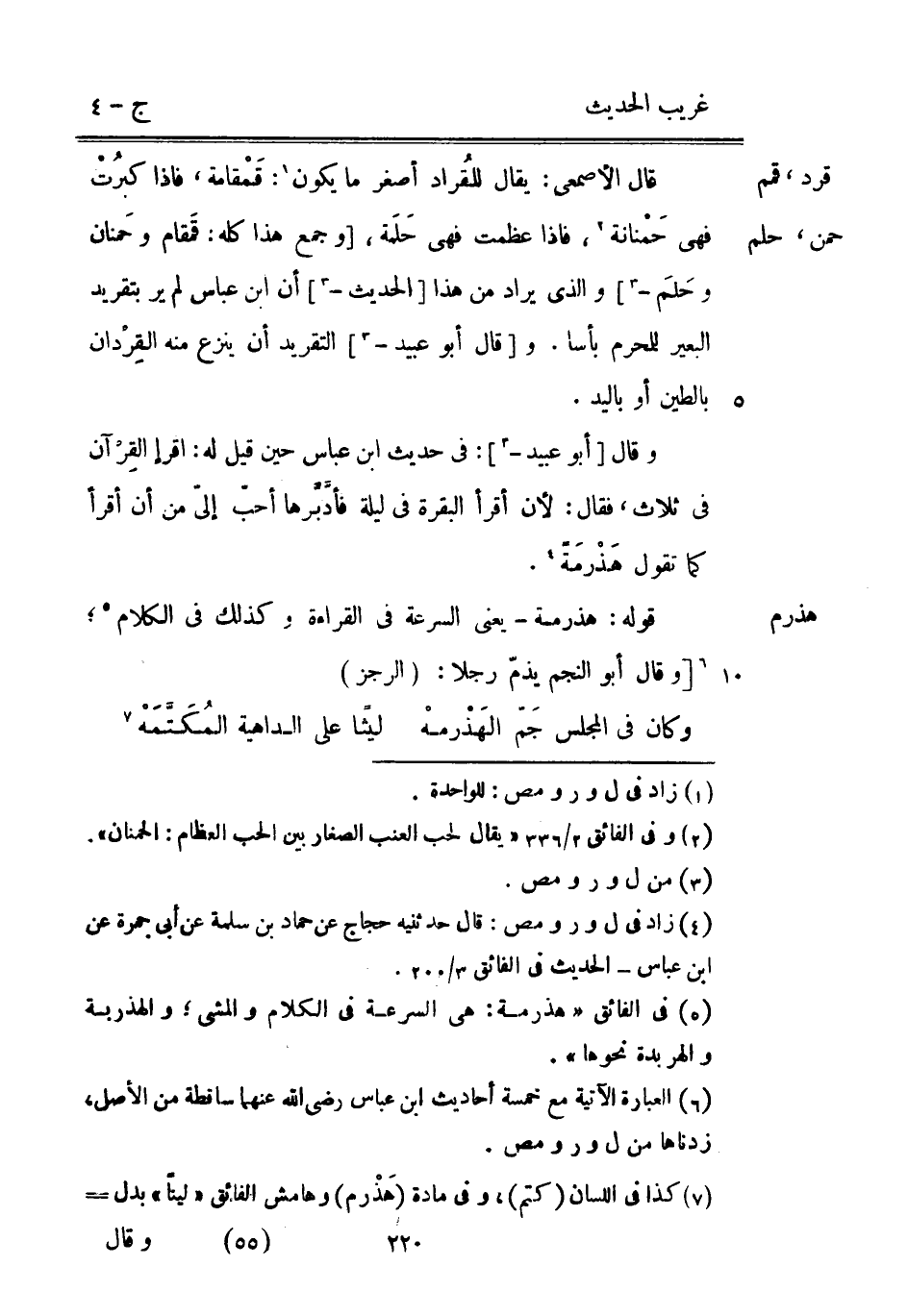 هذرم وَقَالَ [أَبُو عبيد -] : فِي حَدِيث ابْن عَبَّاس حِين قيل لَهُ: اقرإ القِرْآن فِي ثَلَاث فَقَالَ: لِأَن أَقرَأ الْبَقَرَة فِي لَيْلَة فأدَّبَّرها أحبّ إليّ من أَن أَقرَأ كَمَا تَقول هَذْرَمةً. قَوْله: هذرمة يَعْنِي السرعة فِي الْقِرَاءَة وَكَذَلِكَ فِي الْكَلَام [وَقَالَ أَبُو النَّجْم يذم رجلا: (الرجز)