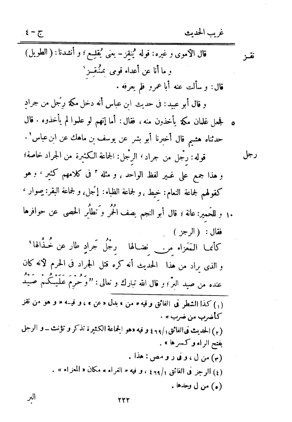 رجل وَقَالَ أَبُو عبيد: فِي حَدِيث ابْن عَبَّاس أَنه دخل مَكَّة رِجْل من جرادٍ فَجعل غلْمَان مَكَّة يَأْخُذُونَ مِنْهُ فَقَالَ: أما إِنَّهُم لَو علمُوا لم يأخذوه. قَالَ حدّثنَاهُ هشيم قَالَ أخبرنَا أَبُو بشر عَن يُوسُف بْن مَاهك عَن ابْن عَبَّاس. قَوْله: رِجْل من جَراد الرِجْل: الْجَمَاعَة الْكَثِيرَة من الْجَرَاد خَاصَّة وَهَذَا جمع على غير لفظ الواحدومثله فِي كَلَامهم كثير وَهُوَ كَقَوْلِهِم لجَماعَة النعام: خِيط ولجماعة الظباء: إجْل ولجماعة الْبَقر: صِوار وللحَمِير: عانة قَالَ أَبُو النَّجْم يصف الحُمُر وتَطُاير الْحَصَى عَن حوافرها فَقَالَ: (الرجز)