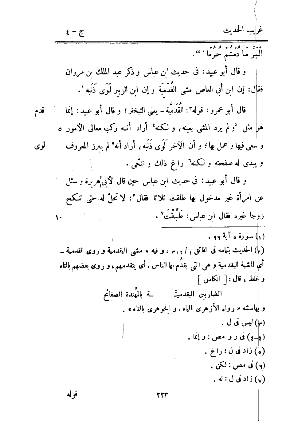 قدم لوى وَقَالَ أَبُو عبيد: إِنَّمَا هُوَ مثل وَلم يرد الْمَشْي بِعَيْنِه وَلكنه أَرَادَ أَنه ركب معالي الْأُمُور وسعى فِيهَا وَعمل بهَا وَأَن الآخر لَوَى ذَنَبه أَرَادَ أَنه لم يبرز الْمَعْرُوف ويبدي لَهُ صفحته وَلكنه راغ ذَلِك وتنحّى. وَقَالَ أَبُو عبيد: فِي حَدِيث ابْن عَبَّاس حِين قَالَ لأبي هُرَيْرَة وَسُئِلَ عَن امْرَأَة غير مَدْخُول بهَا طلقت ثَلَاثًا فَقَالَ: لَا تحلّ لَهُ حَتَّى تنْكح زوجا غَيره فَقَالَ ابْن عَبَّاس: طَبَّقْتَ.