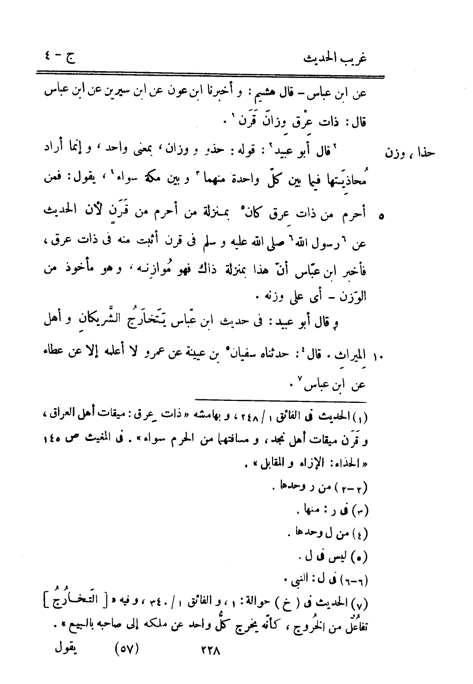 عَن ابْن عَبَّاس قَالَ هشيم: وَأخْبرنَا ابْن عون عَن ابْن سِيرِين عَن ابْن عَبَّاس قَالَ: ذَات عِرْق وِزانَ قَرَن. قَالَ أَبُو عبيد: قَوْله: حَذْو ووزان بِمَعْنى وَاحِد وَإِنَّمَا أَرَادَ مُحاذِيَتها فِيمَا بَين كلّ وَاحِدَة مِنْهُمَا وَبَين مَكَّة سَوَاء يَقُول: فَمن أحرم من ذَات عِرق كَانَ بِمَنْزِلَة من أحرم من قَرَنٍ لِأَن الحَدِيث عَن رَسُول الله صلي اللَّه عَلَيْهِ وَسلم فِي قرن أثبت مِنْهُ فِي ذَات عرق فَأخْبر ابْن عبّاس أنّ هَذَا بِمَنْزِلَة ذَاك فَهُوَ مُوازِنه وَهُوَ مَأْخُوذ من الوَزن أَي على وَزنه.