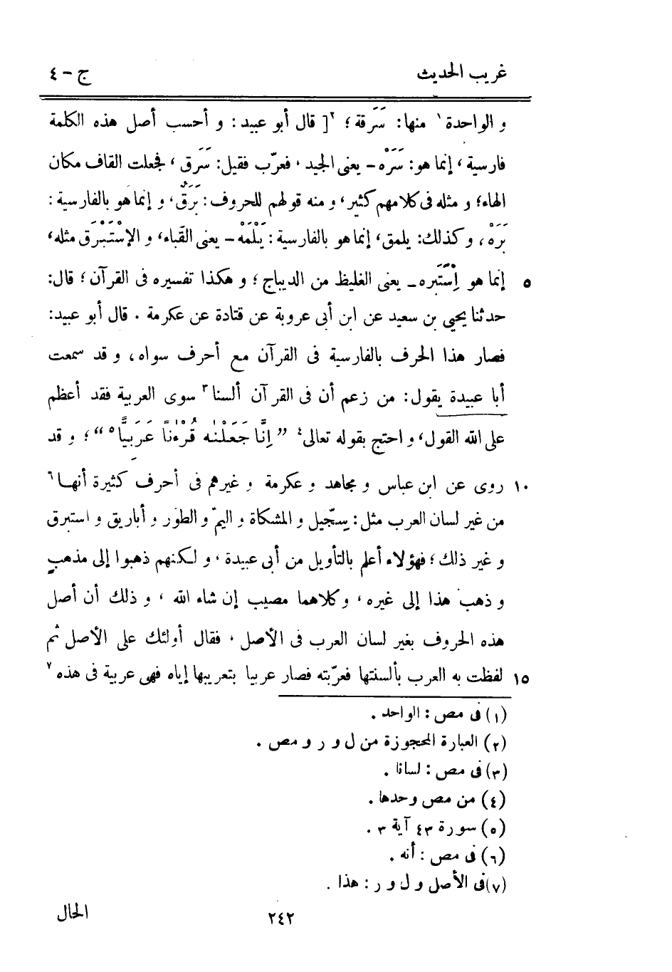 والواحدة مِنْهَا: سَرَقة [قَالَ أَبُو عبيد: وأحسب أصل هَذِه الْكَلِمَة فارسية إِنَّمَا هُوَ: سَرَهْ يَعْنِي الْجيد فعرّب فَقيل: سَرَق فَجعلت الْقَاف مَكَان الْهَاء وَمثله فِي كَلَامهم كثير وَمِنْه قَوْلهم للحروف: بَرَقٌ وَإِنَّمَا هُوَ بِالْفَارِسِيَّةِ: بَرَهْ وَكَذَلِكَ: يلمق إِنَّمَا هُوَ بِالْفَارِسِيَّةِ: يَلْمَهْ يَعْنِي القَباء والإسْتَبْرَق مثله إِنَّمَا هُوَ إِسْتَبَره يَعْنِي الغليظ من الديباج وَهَكَذَا تَفْسِيره فِي الْقُرْآن قَالَ: حَدثنَا يحيى بن سعيد عَن ابْن أبي عرُوبَة عَن قَتَادَة عَن عِكْرِمَة. قَالَ أَبُو عبيد: فَصَارَ هَذَا الْحَرْف بِالْفَارِسِيَّةِ فِي الْقُرْآن مَعَ أحرف سَوْدَاء وَقد سَمِعت أَبَا عُبَيْدَة يَقُول: من زعم أَن فِي الْقُرْآن أَلسنا سوى الْعَرَبيَّة فقد أعظم على الله القَوْل وَاحْتج بقوله تَعَالَى {إِنَّا جَعَلْنَاهُ قُرْآنًا عَرَبياً} وَقد رُوِيَ عَن ابْن عَبَّاس وَمُجاهد وَعِكْرِمَة وَغَيرهم فِي أحرف كَثِيرَة أَنَّهَا من غير لِسَان الْعَرَب مثل: سِجّيل والمشكاة واليمّ وَالطور وأباريق واستبرق وَغير ذَلِك فَهَؤُلَاءِ أعلم بالتأويل من أبي عُبَيْدَة وَلَكنهُمْ ذَهَبُوا إِلَى مذهبٍ وَذهب هَذَا إِلَى غَيره وَكِلَاهُمَا مُصِيب إِن شَاءَ الله وَذَلِكَ أَن أصل هَذِه الْحُرُوف بِغَيْر لِسَان الْعَرَب فِي الأَصْل فَقَالَ أُولَئِكَ على الأَصْل ثمَّ لفظت بِهِ الْعَرَب بألسنتها فعرّبته فَصَارَ عَرَبيا بتعريبها إِيَّاه فَهِيَ عَرَبِيَّة فِي هَذِه