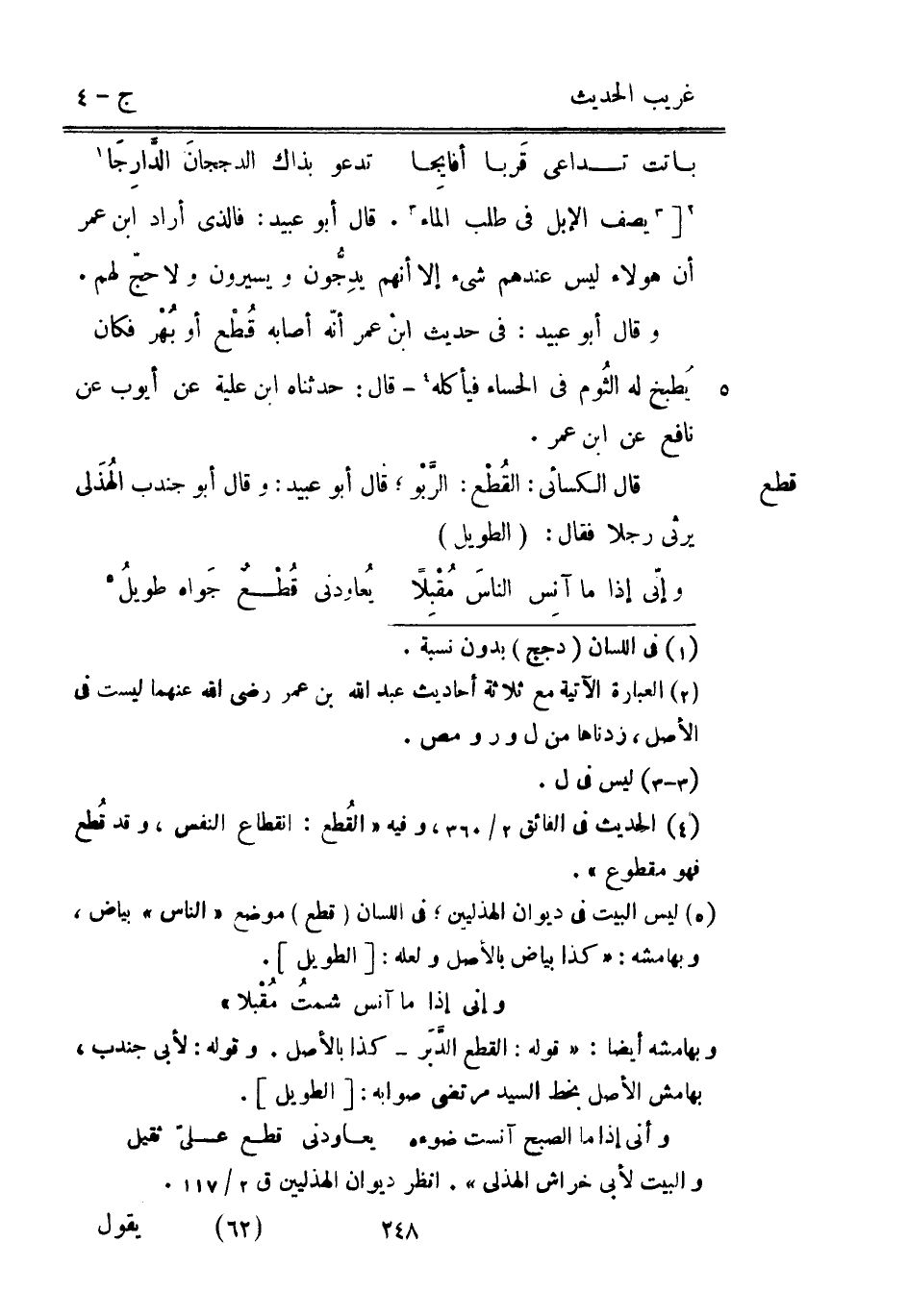 قطع وَقَالَ أَبُو عبيد: فِي حَدِيث ابْن عمر أنّه أَصَابَهُ قُطْع أَو بُهْر فَكَانَ يُطبخ لَهُ الثُوم فِي الحساء فيأكله قَالَ: حدّثنَاهُ ابْن علية عَن أَيُّوب عَن نَافِع عَن ابْن عمر. قَالَ الْكسَائي: القُطْع: الرَّبْو قَالَ أَبُو عبيد: وَقَالَ أَبُو جُنْدُب الهُذَلي يرثي رجلا فَقَالَ: (الطَّوِيل)