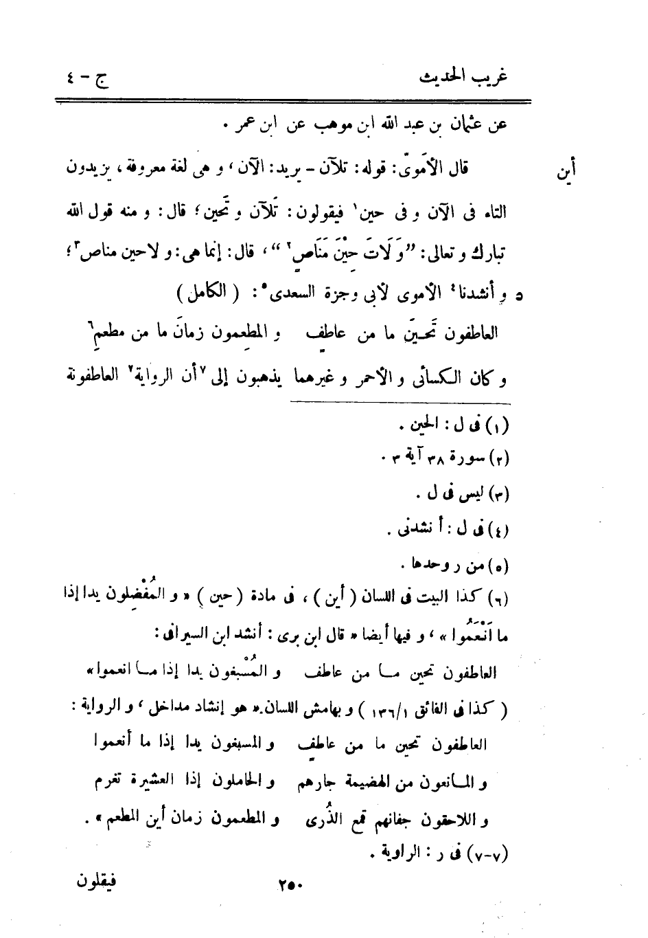 عَن عُثْمَان بن عبد الله بن موهب عَن ابْن عمر. قَالَ الأمَويّ: قَوْله: تلآن يُرِيد: الْآن وَهِي لُغَة مَعْرُوفَة يزِيدُونَ التَّاء فِي الْآن وَفِي حِين فَيَقُولُونَ: تَلآن وتَحين قَالَ: وَمِنْه قَول الله تبَارك وَتَعَالَى: {وَلاَتَ حِيْنَ مَنَاص} قَالَ: إِنَّمَا هِيَ: وَلَا حِين مناص وأنشدنا الْأمَوِي لأبي وجزة السَّعْدِيّ: (الْكَامِل)
