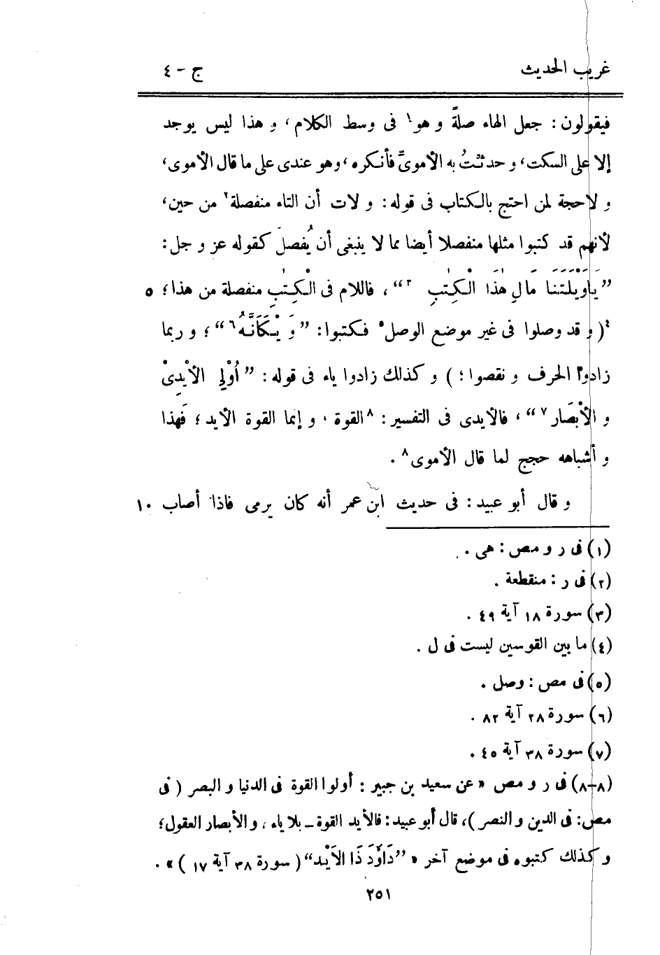 فَيَقُولُونَ: جعل الْهَاء صلَة وَهُوَ فِي وسط الْكَلَام وَهَذَا لَيْسَ يُوجد إِلَّا على السكت وحدثْتُ بِهِ الأمويَّ فَأنكرهُ وَهُوَ عِنْدِي على مَا قَالَ الْأمَوِي وَلَا حجَّة لمن احْتج بِالْكتاب فِي قَوْله: ولات أَن التَّاء مُنْفَصِلَة من حِين لأَنهم قد كتبُوا مثلهَا مُنْفَصِلا أَيْضا مِمَّا لَا يَنْبَغِي أَن يُفصلَ كَقَوْلِه عز وَجل: {يَا ويلتنا مَا لهَذَا الْكتاب} فَاللَّام فِي الْكِتبِ مُنْفَصِلَة من هَذَا (وَقد وصلوا فِي غير مَوضِع الْوَصْل فَكَتَبُوا: {وَيْكَأَنَّهُ} وَرُبمَا زادوا الْحَرْف ونقصوا) وَكَذَلِكَ زادوا يَاء فِي قَوْله: {أُوْلِى الأيْدِيْ والأبْصَار} فالأيدي فِي التَّفْسِير: الْقُوَّة وَإِنَّمَا الْقُوَّة الأيد فَهَذَا وأشباهه حجج لما قَالَ الْأمَوِي.