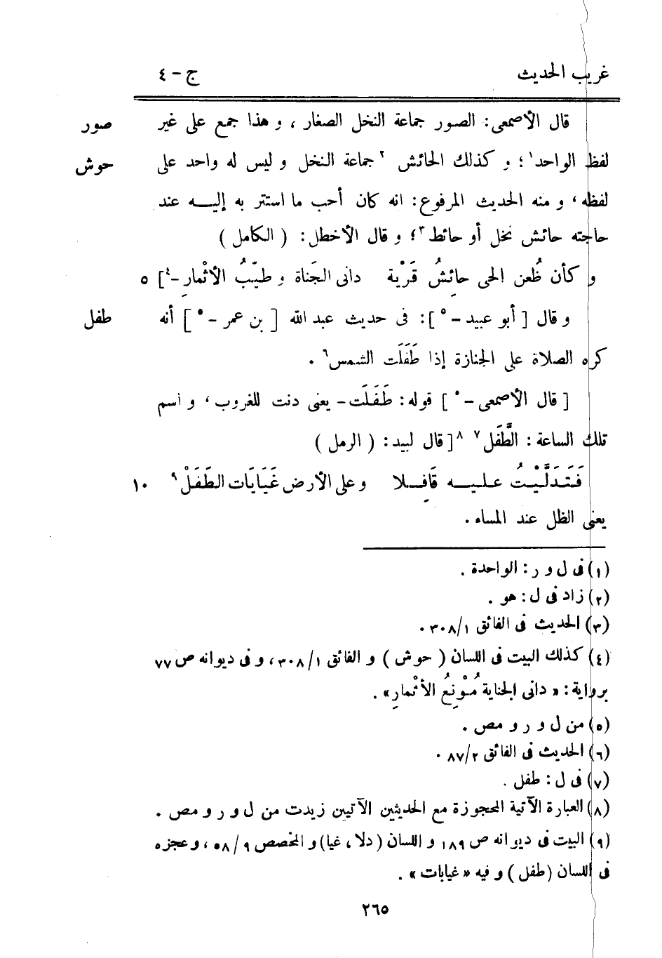 طِفْل وَقَالَ [أَبُو عبيد -] : فِي حَدِيث عبد الله [بن عمر -] أَنه كره الصَّلَاة على الْجِنَازَة إِذا طَفَلَت الشَّمْس. [قَالَ الْأَصْمَعِي -] قَوْله: طَفَلَت يَعْنِي دنت للغروب وَاسم تِلْكَ السَّاعَة: الطَّفَل [قَالَ لبيد: (الرمل)