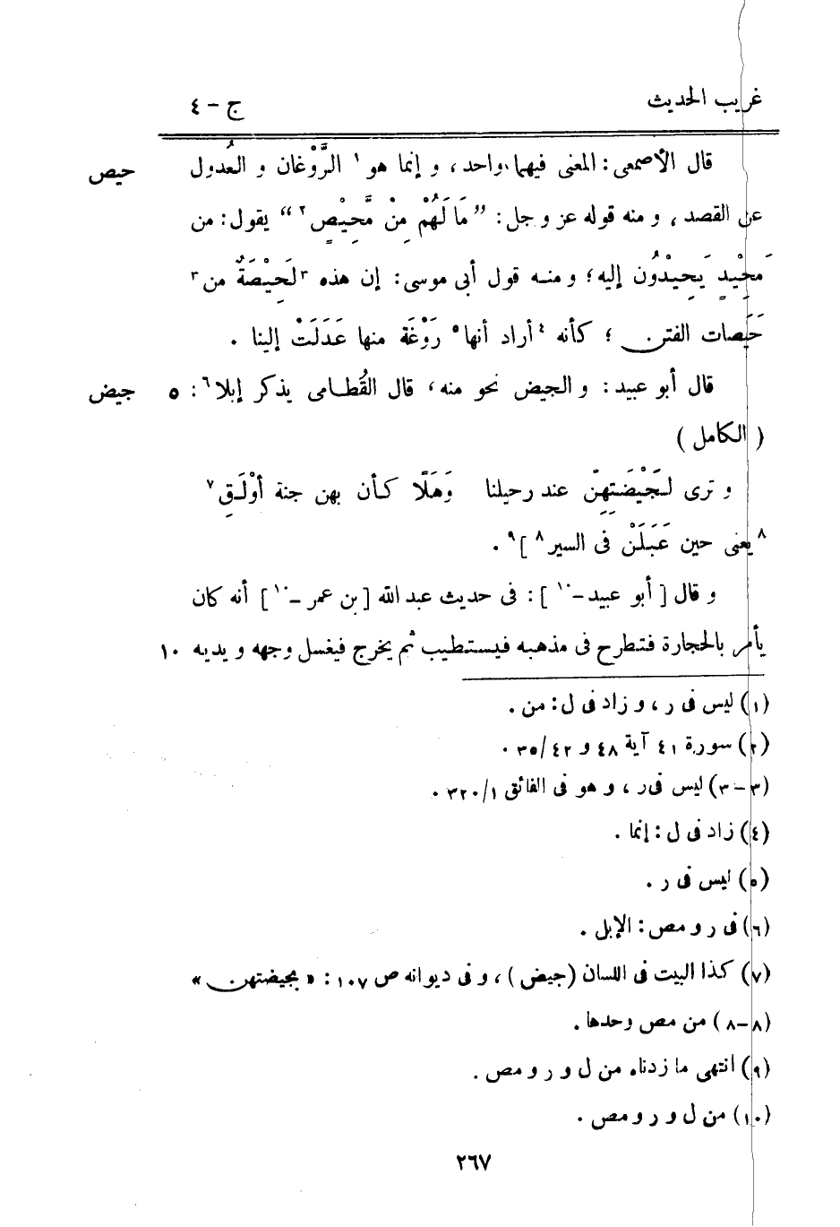 قَالَ الْأَصْمَعِي: الْمَعْنى فيهمَا وَاحِد وَإِنَّمَا هُوَ الرَّوْغان والعُدول عَن الْقَصْد وَمِنْه قَوْله عز وَجل: {مَا لَهُمْ مِنْ مَّحِيْصٍ} يَقُول: من مَحِيْدٍ يَحِيْدُون إِلَيْهِ وَمِنْه قَول أبي مُوسَى: إِن هَذِه لَحِيْصَةٌ من حَيَصات الْفِتَن كَأَنَّهُ أَرَادَ أَنَّهَا رَوْغَة مِنْهَا عدلت إِلَيْنَا.